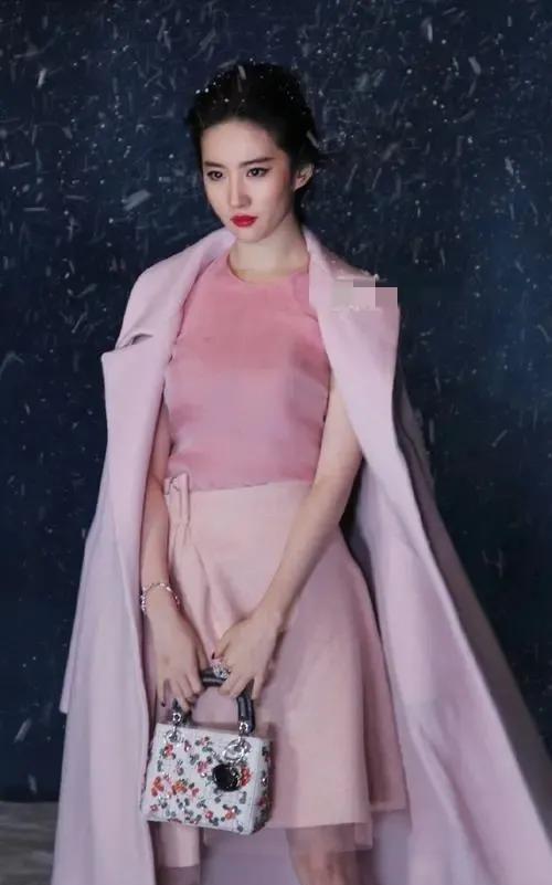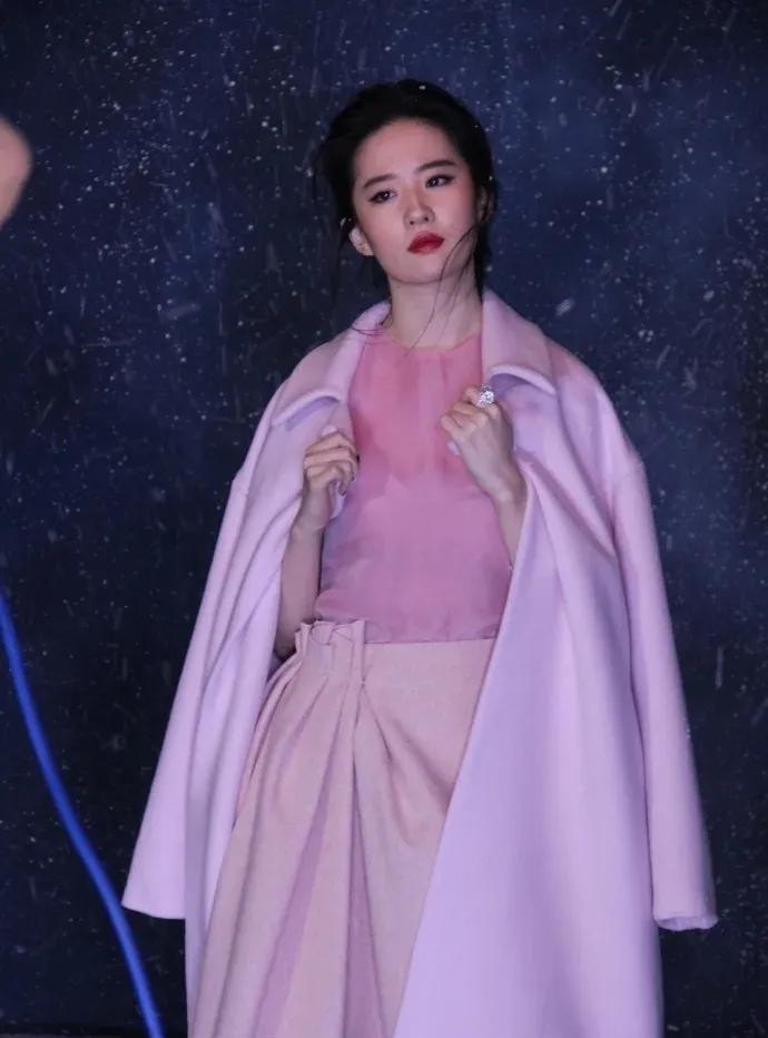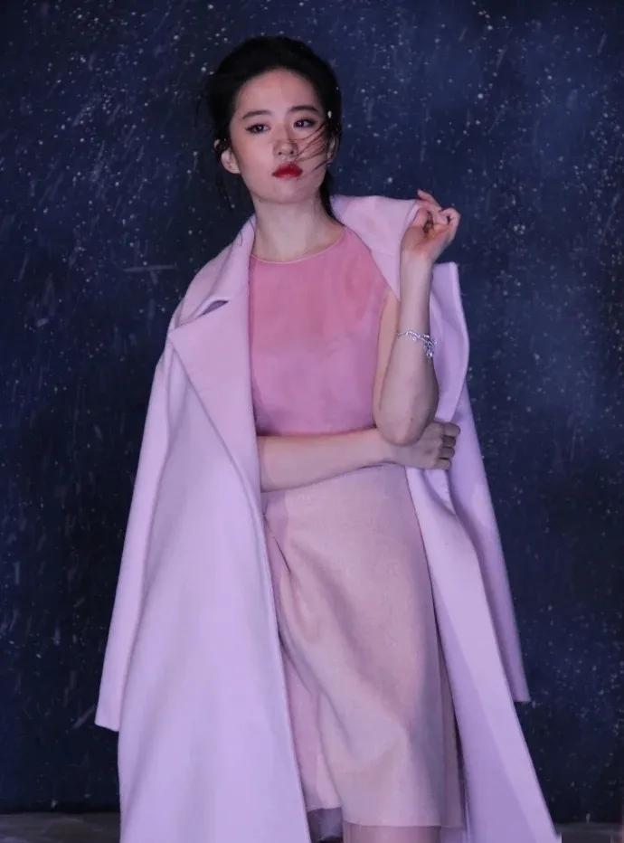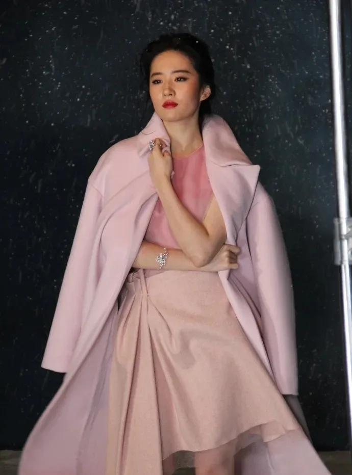 同色系混搭,粉色不显白,但刘亦菲依旧白嫩,皮肤真好。#刘亦菲#