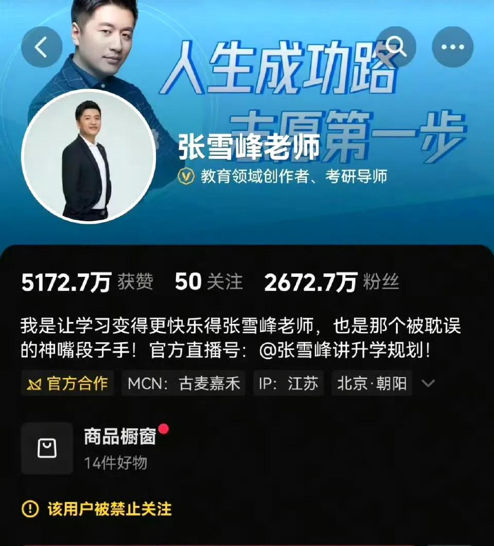 突发,张雪峰出事了? 9月24日晚上,张雪峰的多个社交平台账号已经不能关注,一开始我还有点怀疑消息的真实性,心想不至于,于是搜索了一下,结果很意外,居然是真的。 5000万的言论引爆舆论后不久,账号不能关注了,这是巧合吗?