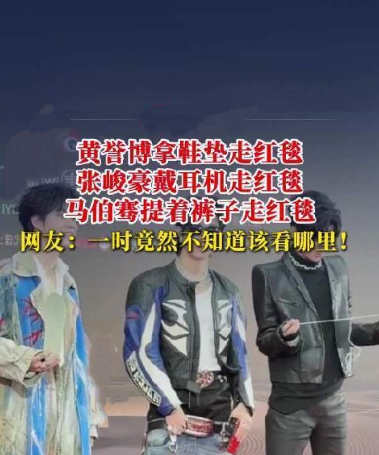 在2025年的活动红毯上,马伯骞、黄誉博、张峻豪的造型引发了网友的热议。 马伯骞此次红毯穿了叠穿的吊裆裤,被网友吐槽像“小时候拉完屎,提着裤子找大人擦屁股”,显腿短还散发出一种不好好穿裤子的叛逆,整体造型十分辣眼。 黄誉博则被调侃举着鞋垫走红毯,不知其拿着类似鞋垫物品的用意是什么,让网友觉得很奇怪。 张峻豪原本看着比较正常,但突然掏出耳机戴上,在合照环节还和其他两人即兴“cos”机车,让人觉得有些抽象。#张峻豪#马伯骞#黄誉博