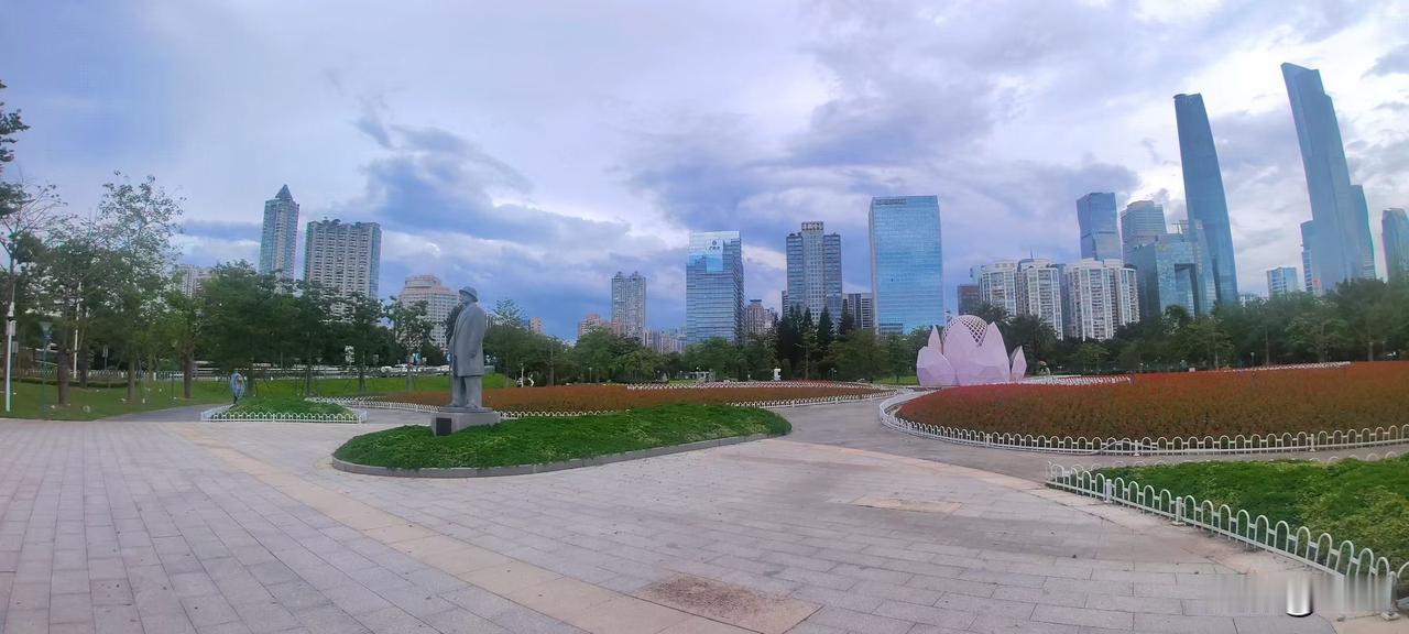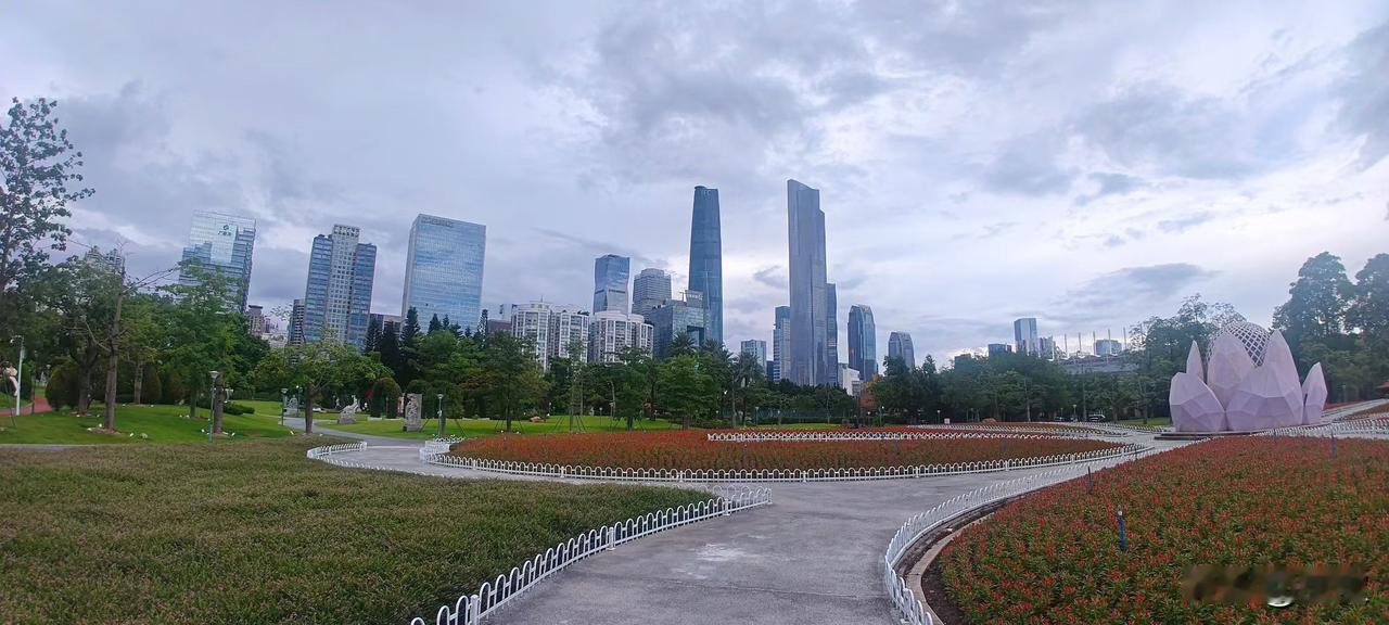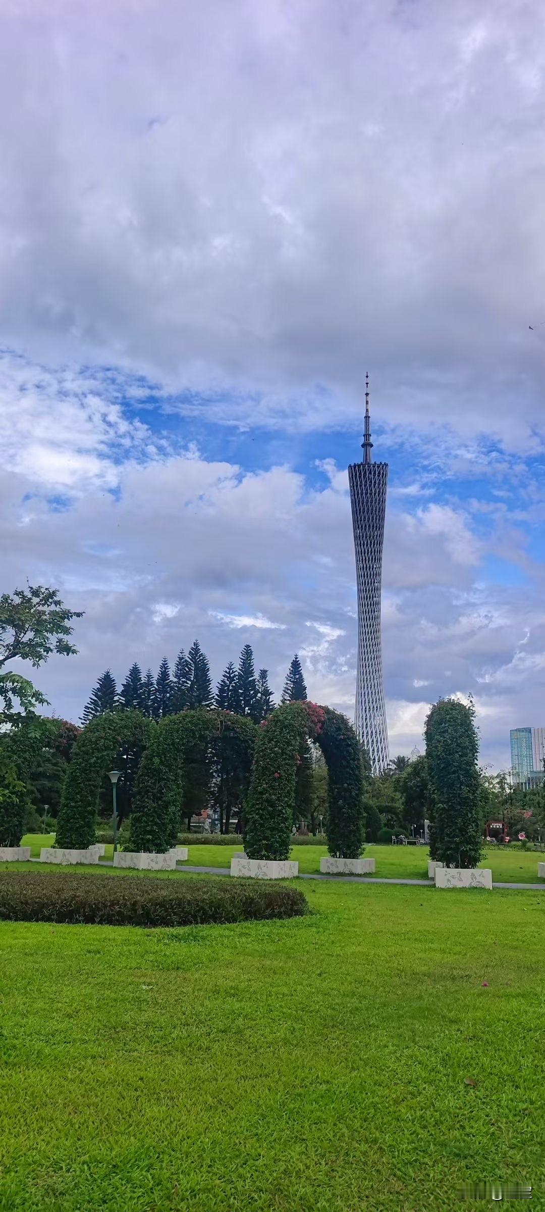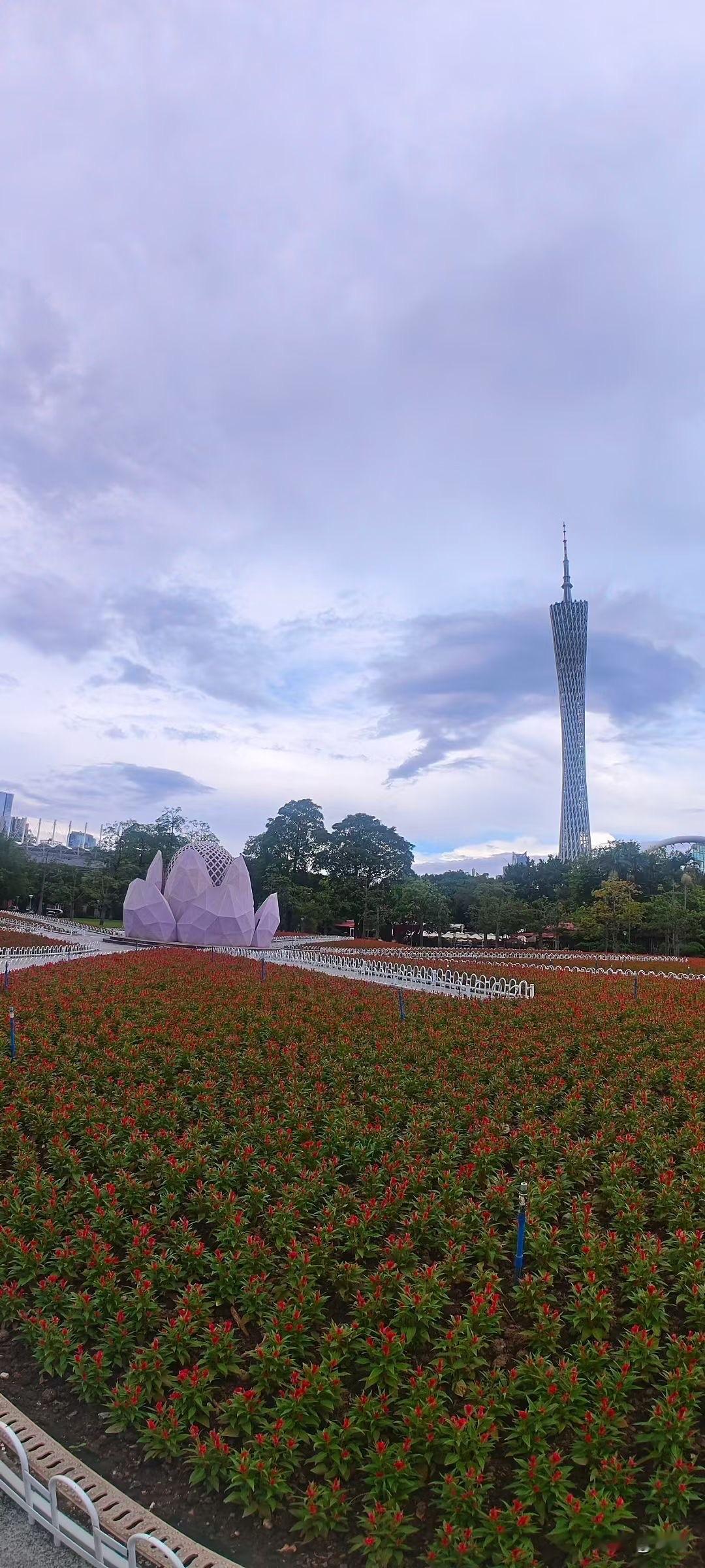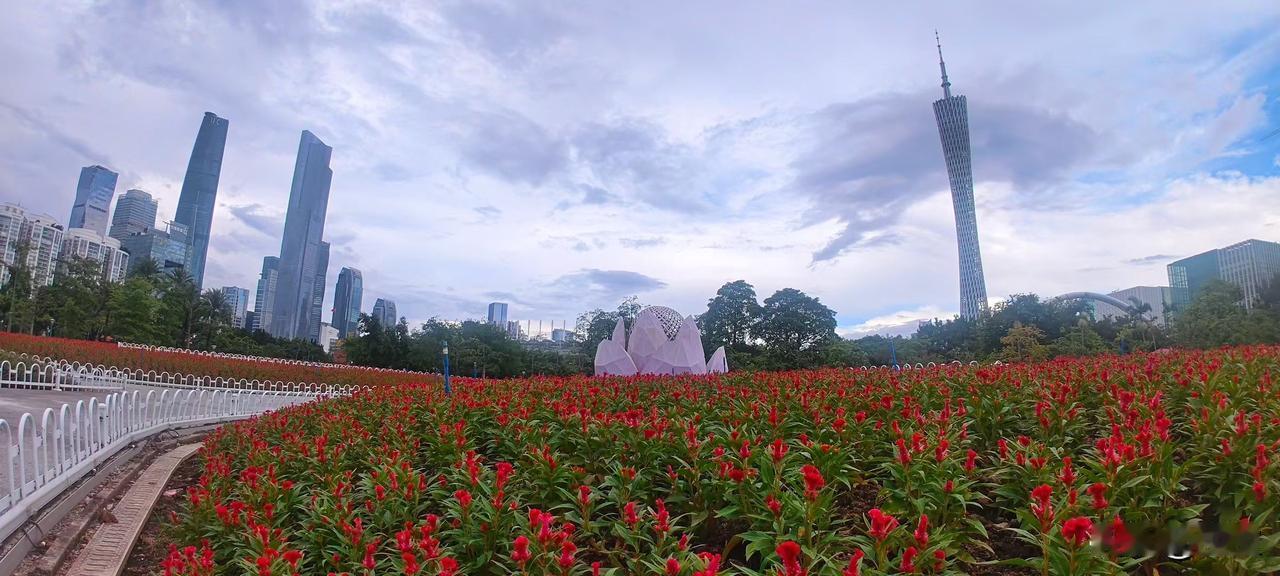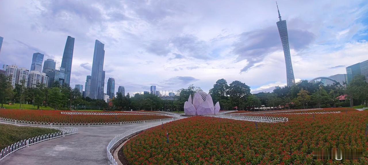 【台风“塔巴”来临前的广州】台风“塔巴”来临前,广州的天空被大片云层覆盖,像一块蒙着薄纱的幕布。广州塔如一把利剑,直插这略显压抑的天幕。宏城公园的花草仍肆意舒展,红色花朵簇拥成海,那朵巨大的粉色“莲花”雕塑静静伫立,与周围的绿植、蜿蜒小径相映成趣。城市里的高楼大厦在云层下静默着,仿佛在等待风雨的洗礼,而此刻,公园的静谧与城市的现代感交融,呈现出一种别样的氛围。