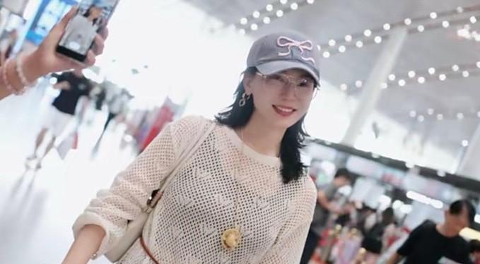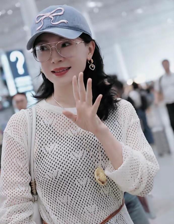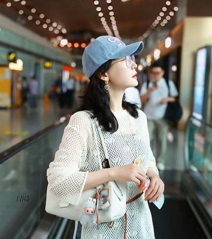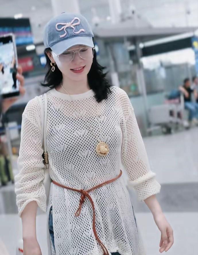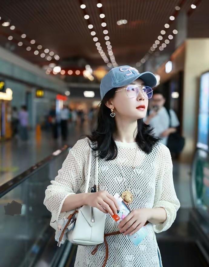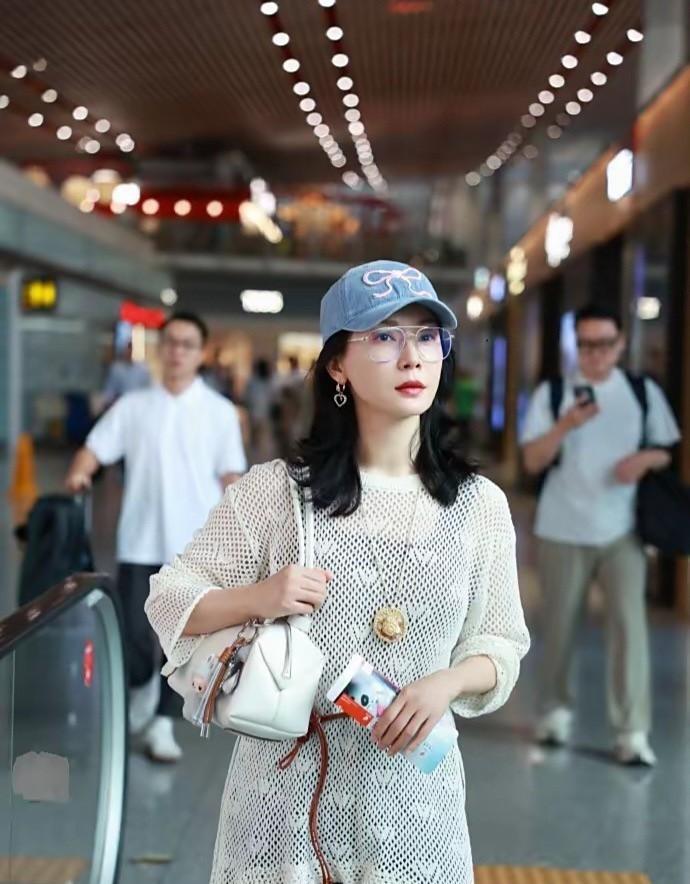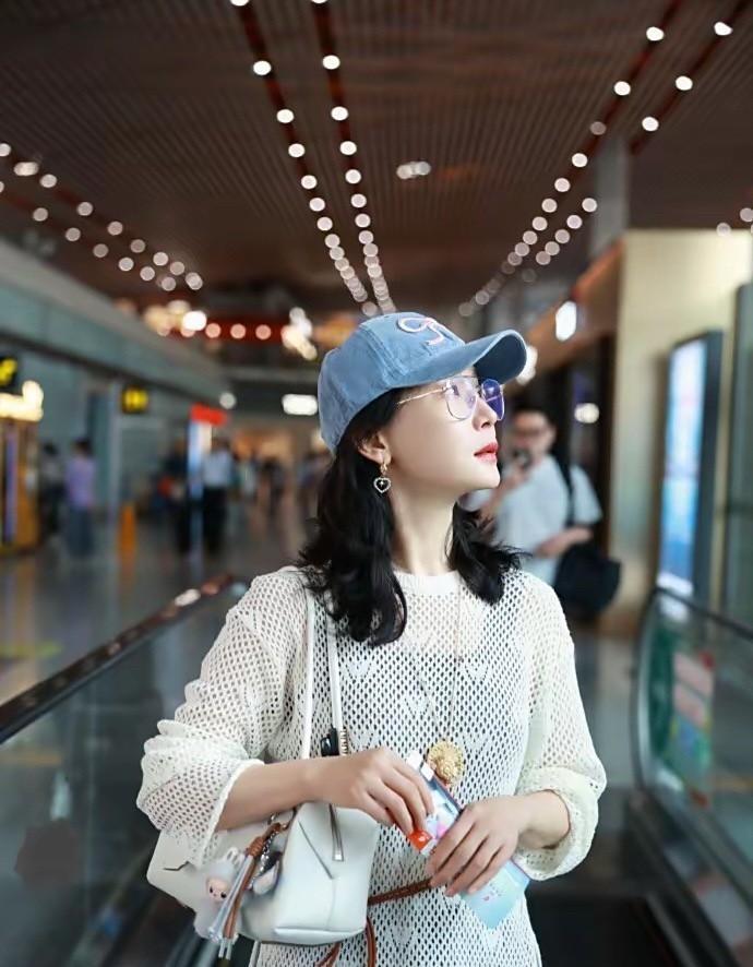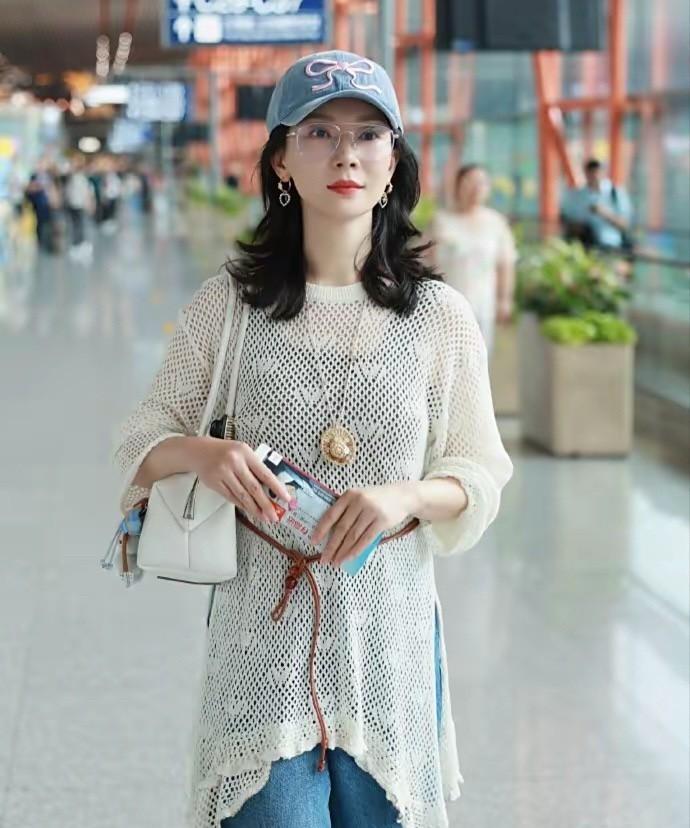 陈数最近的机场造型太绝了! 一件看似普通的白色镂空针织长衫,搭配牛仔裤和棒球帽,