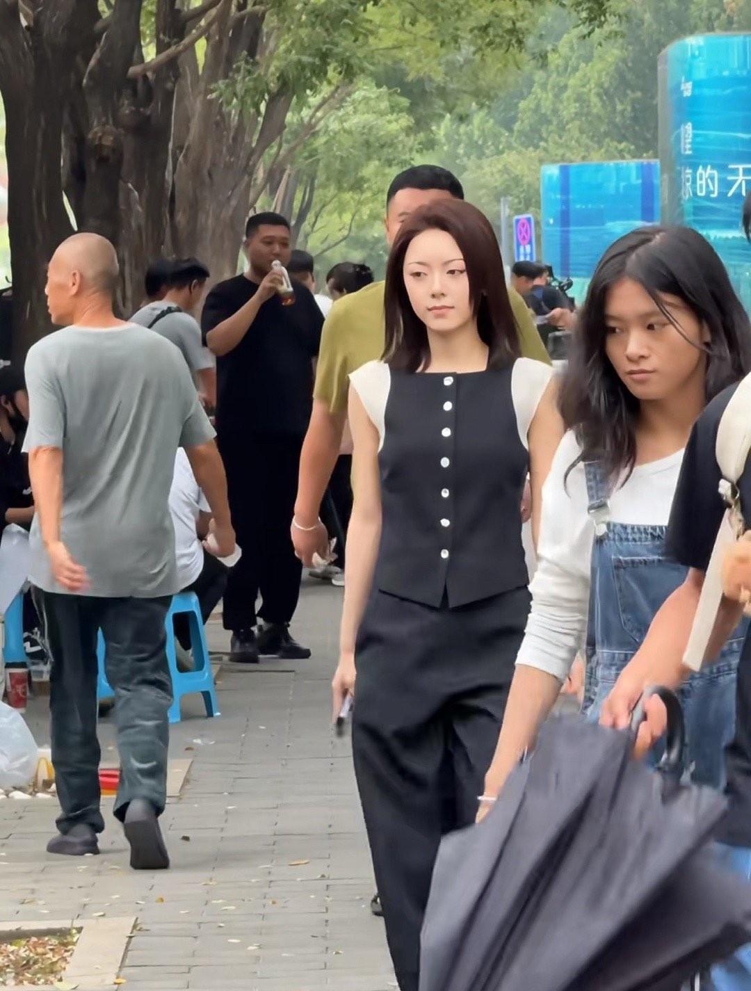 赵今麦路人下镜头生图原来长这样! 北京日默瓦活动现场,一身黑白拼接上衣配阔腿裤,
