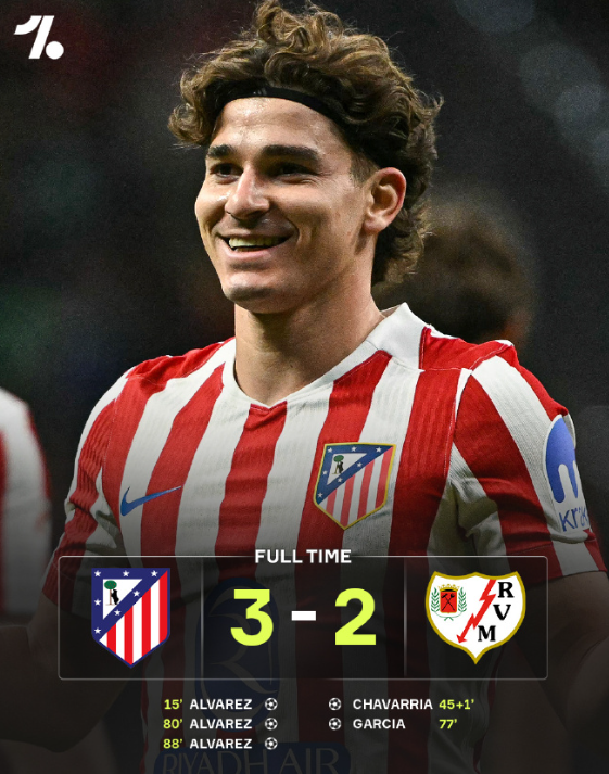 马竞3-2巴列卡诺,非常艰难的比赛,小蜘蛛上演帽子戏法,一己之力帮助球队。 马竞本赛季之前就赢了一场比赛,主场2-0比利亚雷亚尔,同样巴列卡诺也只赢了一场,而且巴列卡诺本赛季还要踢欧协联。 这个帽子戏法,也是梅西之后,第一位阿根廷人在西甲上演帽子戏法,很多人说2026年要不要让小蜘蛛加盟巴萨,我觉得巴萨还是很需要南美人震场子,无论是阿根廷人还是巴西人~