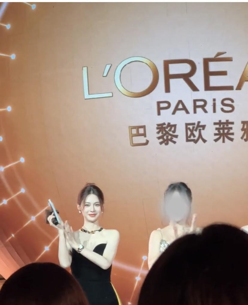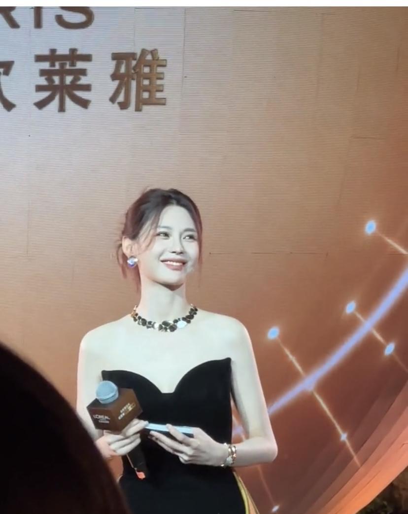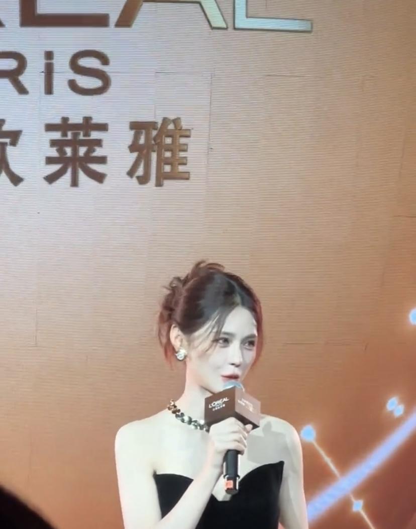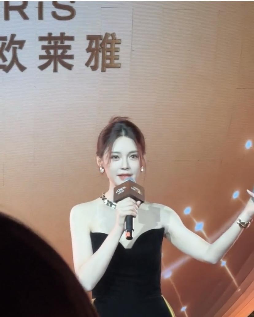 2025年9月欧莱雅新品发布会上,沈梦辰的亮相简直绝了。她穿着黑金抹胸开叉礼服裙