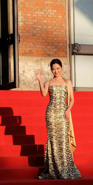 只是她穿的这套礼服有点减分呀,类似于豹纹的亮丝紧身露肩礼服,搭配金色飘带,显得有点壮硕,这身衣服看起来也有点土豪的豪气。