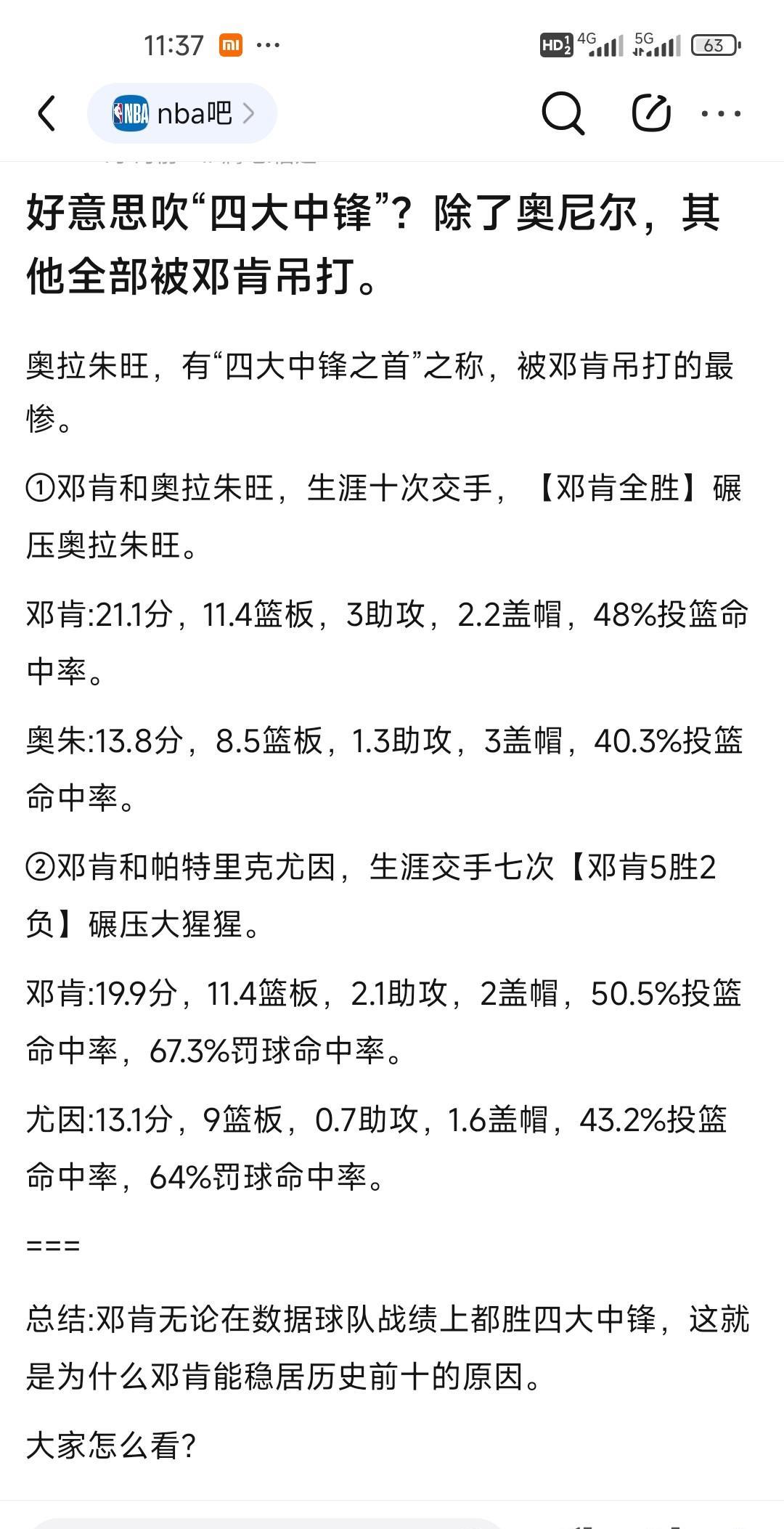 除了奥尼尔,所谓的四大中锋是不是都被邓肯吊打? 奥拉朱旺,生涯跟邓肯交手十次,邓肯全胜! 邓肯21分11篮板,奥拉朱旺13.8分8.5篮板 尤因,生涯交手7次,邓肯5胜2负! 邓肯场均19分,11篮板,尤因13分, 其实,我觉得这样比较有些太片面了! 这一看就是奥拉朱旺和尤因都是处于职业生涯暮年,而邓肯正处于当打之年, 只能说职业生涯有重合! 而奥尼尔则是盛年,自然不弱于邓肯了! 而且球队胜负,跟球队阵容也有关系!