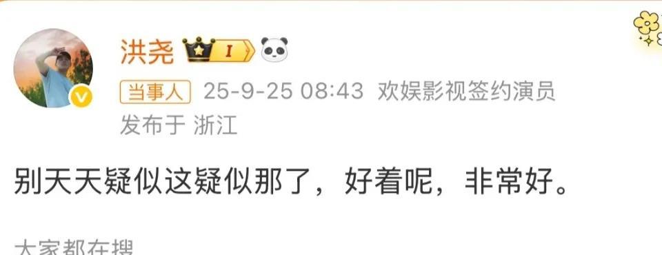 洪尧回应与吴谨言婚变传闻。 有网友发现洪尧疑似删除了和吴谨言的结婚博文,被猜测是否婚变。据悉,吴谨言、洪尧两人因2017年合作拍摄电视剧《延禧攻略》相识。2024年9月13日,吴谨言、洪尧发博晒出结婚证,配文:“今天领的”,“今天结的”,并艾特彼此,甜蜜官宣结婚的好消息。今年2月吴谨言生了一个可爱的女儿,正式升级一家三口。 官宣那条博文看不到了,好像只是设置的近一年可见,并不是删除了,随后洪尧也进行解释:别天天疑似这疑似那了,好着呢,非常好! 至于一直在意说男生黑.历.史多的,其实大可不必,如果男方有问题,恋爱能坚持7年也不大可能。女明星能走进一段婚姻需要很大的勇气,既然选择了就是足够的了解足够的信任足够的爱了!祝福就好!
