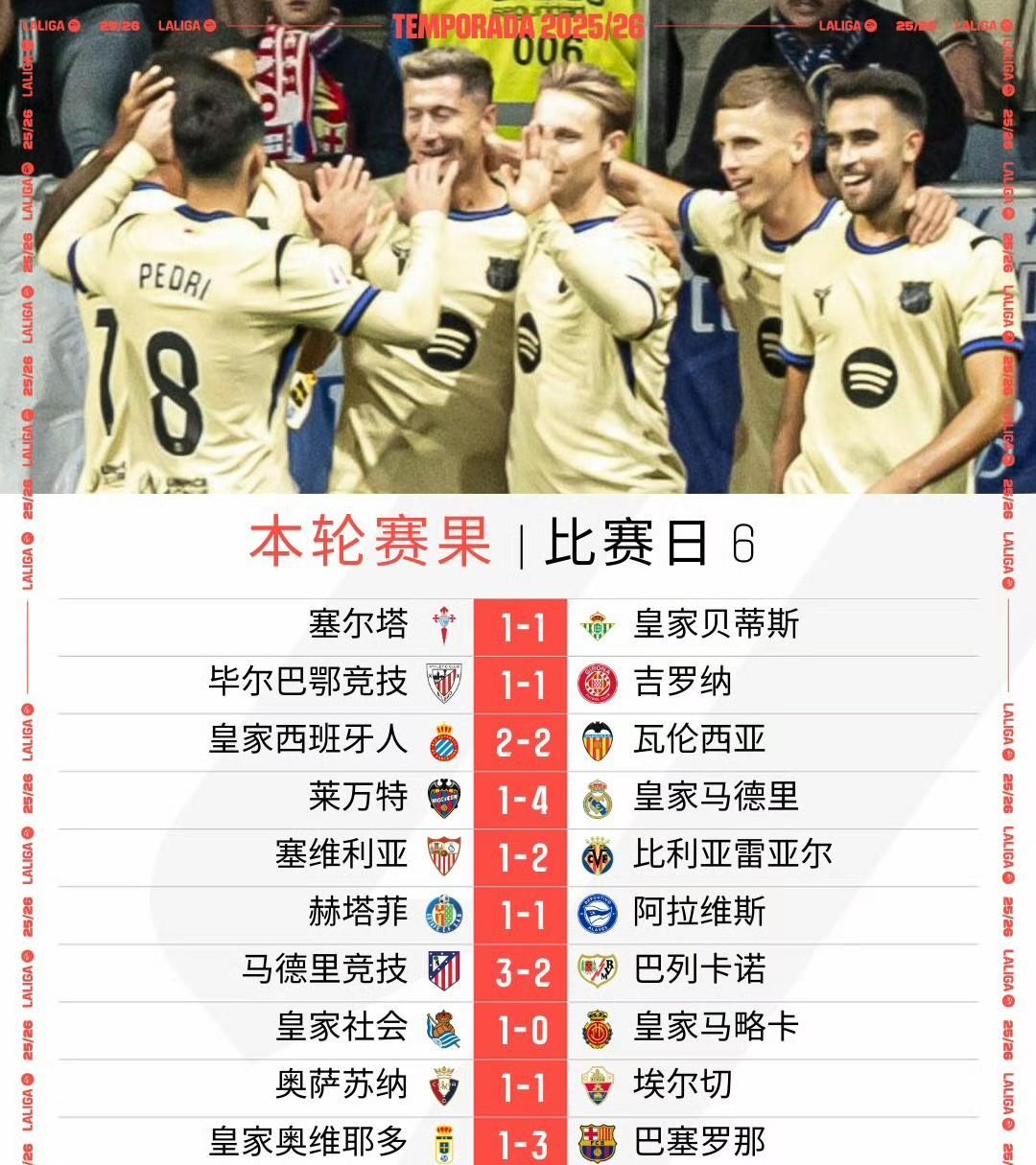 调整及时!巴萨逆转升班马继续追击皇马。 西甲第6轮最后一战,巴萨客场3:1逆转击败皇家奥维耶多。上半场门将失误曾送给对方率先破门,下半场弗里克及时调整,加西亚、莱万、阿劳霍破门,巴萨逆转拿到3分。因为一周双赛,还是有球员发挥不够稳定,关键时刻要有人站出来,阿劳霍状态相对更好,拉什福德也有助攻,但也有球员状态一般。巴萨目前5胜1平紧追皇马,两队都已经甩开后面至少1个胜场。除此之外,黑马埃尔切补时绝平,依然保持不败,也成为了西甲除皇马巴萨外唯一保持不败的球队。
