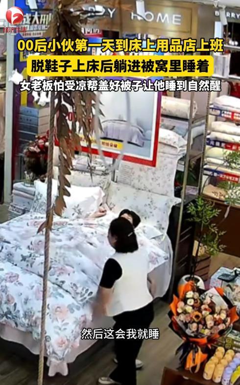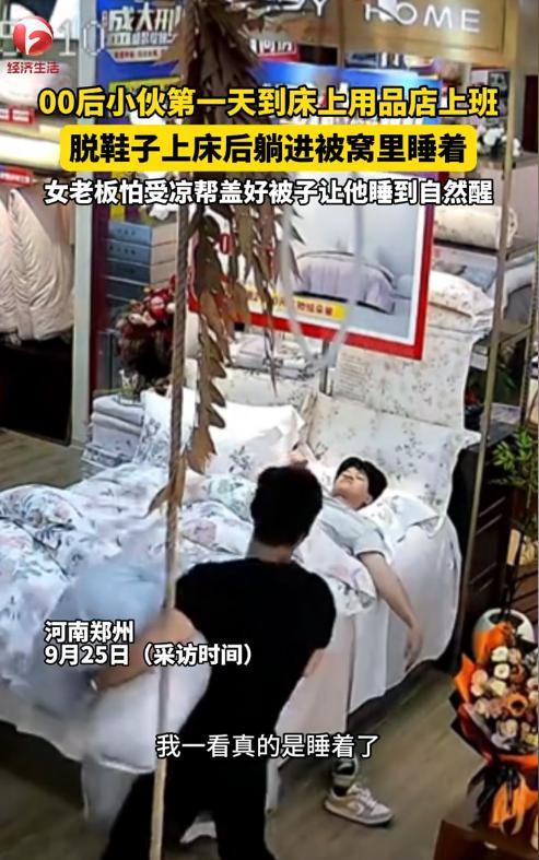 “活该她发财!”9月20日,河南郑州,一00后小伙第一天去床上用品店上班,干完活后觉得太累,就脱掉鞋子到床上躺了一会儿,没想到竟然舒服得睡着了!老板娘发现后不仅没有责怪小伙,反而贴心的给盖好被子,让他睡到自然醒。网友:这就是最好的广告! 如今00后已经成为求职的主力军,每年毕业季,都有大量大学生出来找工作,不过,00后却有些与众不同,他们似乎不关心专业是否对口,也不关心工资高低,只要这个班上得舒服就行。 这天,小伙是第一天到马女士的床上用品店上班,到了中午,小伙把要干的活干完后,突然困意袭来,而周围刚好都是床,他就随便选了一张床,拖了鞋子就上去休息了。 小伙本来只打算眯一会眼,没想到床太舒服了,直接睡着了,同事路过后满眼的不可置信,自己干了这么久都没这么睡过,他是真的大胆! 过了一会儿,马女士也注意到了小伙,随后快步走过来,本以为小伙要挨训了,没想到马女士是担心小伙着凉,帮他盖了盖被子,随后就离开了。 小伙一觉睡到自然醒,醒来后自己也不敢相信,生怕因为耽误了工作而被辞退,可是马女士并没有责怪他。 很多人都说00后是来整顿职场的,可那些都是无良老板,遇到这么好的老板谁舍得离开呢。 大家对此事有什么看法? 信息来源:《00后小伙第一天到床上用品店上班,干完活后,脱鞋子上床躺进被窝里酣睡,女老板怕他受凉,帮他盖好被子让他睡到自然醒。》AHTV第一时间