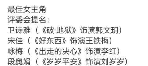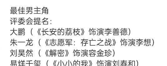 本届金鸡奖最佳男女主、男女配提名: 最佳男主提名: 大鹏(长安的荔枝》) 朱一龙