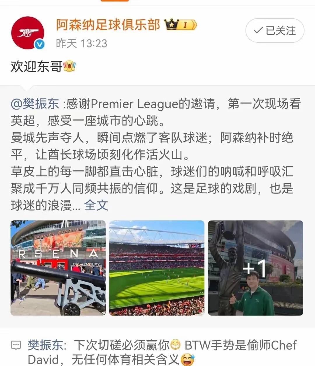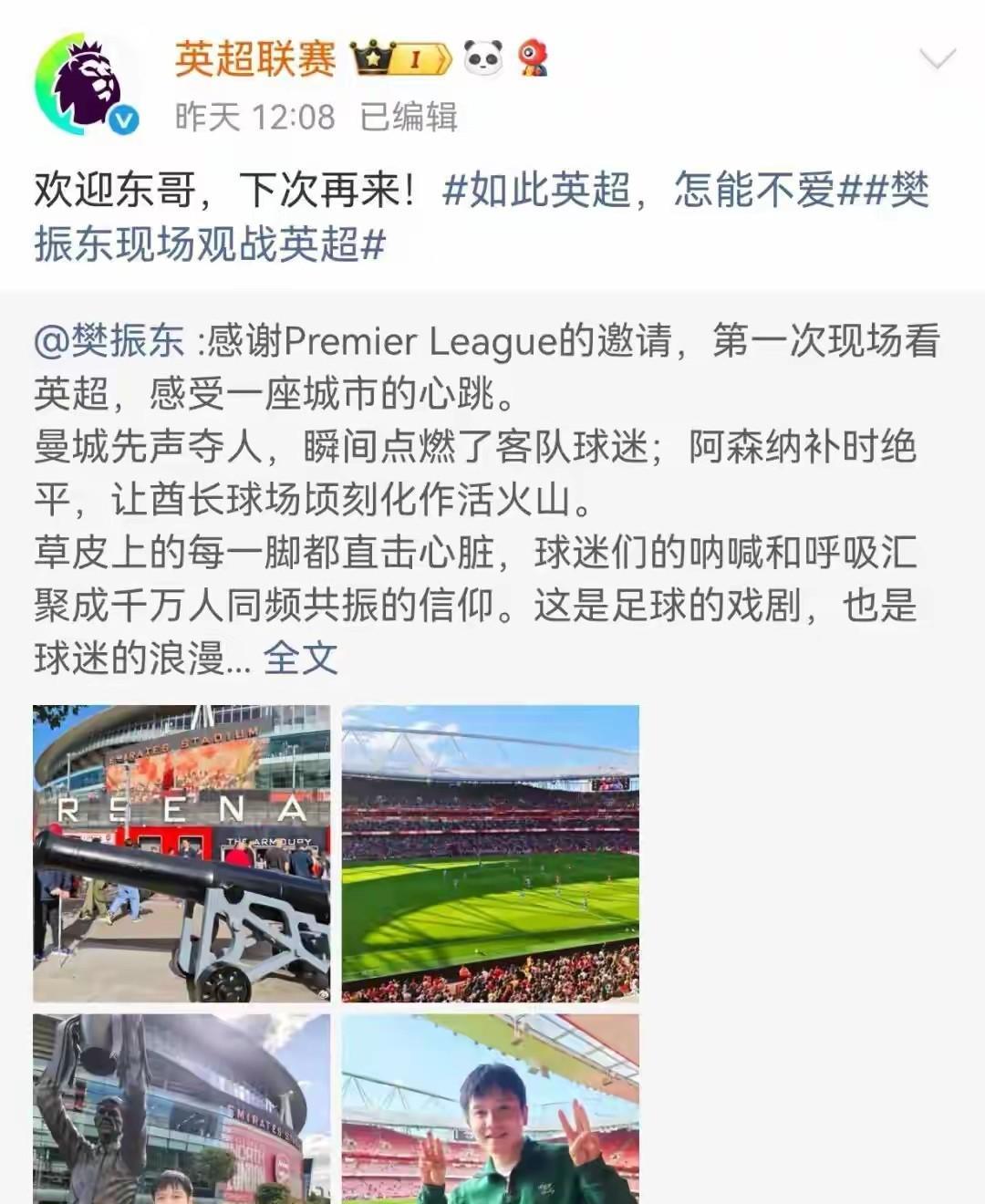 英超也感受到樊振东的流量, 东哥轮休, 去看了阿森纳和曼城的比赛, 只是摆拍了几张照片, 结果英超网上的热度, 呼的一下上来了! 英超老板估计纳闷, 这是什么巨星带来的流量? 最近也没引进巨星呀[呲牙] 现在知道了吧! 英超,阿森纳官网欢迎东哥。 西甲这也正式邀请东哥去看球! 东哥别去看西甲了, 快回来拯救中超吧!