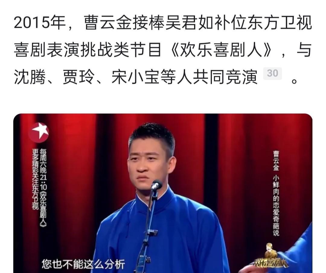 曹云金10年退出德云社以后,12年,13年,14年连上三年央视春晚,15年上了当年最火的综艺《欢乐喜剧人》(自己退赛了),17年上了《吐槽大会》脱口秀节目,可以说,那几年的曹云金,红的发紫,还有相声小王子的名号,何来的被打压十几年之说。 只能说两次大爆的综艺,曹云金都没抓住机会,16年岳云鹏参加《欢乐喜剧人》第二季直接拿了冠军,德云一哥的名号,直接盖过了曹云金的相声小王子, 21年阎鹤祥参加脱口秀节目大火,24年喜单,阎鹤祥又大爆,直接上了春晚。 所以说,12年~17年,曹云金是大火综艺选相声演员的首选,毕竟曹云金连上了三次春晚,还自带热度,那几年曹云金既没好好说相声,更没有拿的出手的作品,荒废了大把好时光,16年以后,岳云鹏越来越火,综艺、电视剧,电影首选都是德云社,路是自己走的,机会没把握住,就谁都怨不着。#曹云金的辉煌时刻#