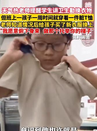 近日,在重庆开州区,一名女教师将一名小男孩叫到办公室,提醒他身穿的T恤衫已经脏了。然而,一周时间过去了,孩子的衣服依然没有更换。这时,老师才意识到,问题并非出在孩子不爱干净,而是他根本没有多余的衣服可以替换。 重庆开州的校园里,10岁小男孩的那件T恤太扎眼了。 洗得发白的白色料子已经泛黄发灰,袖口磨出了一圈毛边,胸前还沾着几块洗不掉的褐色污渍,凑近了能闻到淡淡的汗味。 女老师把他叫到办公室,语气里带着点温和的提醒,下次记得把衣服换了呀。 可一周后的早自习,老师再看向那个座位时,心一下子沉了下去。 男孩身上还是那件脏T恤,污渍比之前更明显了。 她悄悄拉住男孩问了两句,孩子低着头抿着嘴不说话,好半天才挤出一句“没有衣服换”。 这孩子懂事得让人心疼,妈妈在他很小的时候就走了,爸爸为了赚钱常年在外打工,家里只有卧病在床的爷爷。 10岁的小人儿踩着小板凳才够得着洗衣机,水花溅湿裤脚也不在意。 爷爷颤巍巍切菜时,他就端着水盆在旁边接水,小手冻得通红也不吭声。 农忙时节,还得跟着邻居下地帮忙除草。 知道真相后,老师没声张。那天午休,她特意绕到学校附近的超市,挑了件浅蓝色的纯棉短袖,尺码刚好适合男孩。 趁办公室没人,她把装着衣服的蓝色购物袋塞给孩子,声音放得很轻,老师给你买的,试试合不合身。 男孩抱着袋子愣了愣,换衣服时总偷偷瞅她,嘴角抿得紧紧的。 老师见状笑着逗他,穿得这么合适,不谢老师呀? 男孩的脸一下子红了,还是没说话,却悄悄把旧衣服叠得整整齐齐收进了袋子。 老师常会把家里带的饼干、牛奶悄悄放在男孩桌上;午餐打饭时,总不动声色地多给他舀一勺红烧肉。 男孩都记在心里,原本成绩中等的他,写字越来越板正,眼神里也多了股坚定劲儿,月考名次往前跳了十多名。 妈妈不在了,哥哥治病要花不少钱,全家就靠爸爸种地糊口,校服对他们来说是“额外开支”。 班主任走过去把她抱在怀里,轻声说,别哭啦,老师给你定了两套。 这些事传到网上,网友们的评论里全是共鸣。 有人说“老师是唯一没血缘却盼你飞高的人”,有人感慨“遇良师真的是一辈子的幸运”。 再想起重庆开州那位老师,她没做什么惊天动地的大事,就是一件合身的短袖、几次耐心的谈心、打饭时多给的一勺肉。 说到底,教育不只是教孩子认多少字、算多少题,更要护好他们的童真和尊严。 而护童真的背后,藏着的是教育者的责任,像那位老师说的,愿做托举孩子的梯子。 更藏着整个社会的担当,需要我们每个人多些留意、多些伸手。 只有这样,每个穿脏衣服的孩子都能有新衣服穿,每个没校服的孩子都能不流泪,每个困境里的孩子都能看到光。 信息来源:江北融媒2025-09-25发布视频