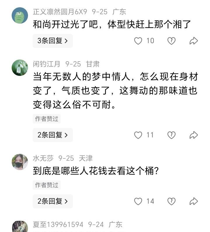 到底是谁在花钱看一个桶在台上滚? 最近阿娇的近照公开,真的胖得不是一点半点,都快变成一个球了! 特别是她前两个月的演唱会,胖得太吓人了。用网友的话说,就是:一个桶在台上走来走去! 真的很佩服网友的形容词,一个比一个毒舌! 因为胖,演唱会几乎没有什么大动作,唯一的动作就是从舞台这边走到那边。 说真的,既然当了明星,又开演唱会,就应该去运动运动,把最好的展现给观众,何况你这还是收费的!要不然显得太敷衍了!难道真让观众去看一个桶?[呲牙]#阿娇#
