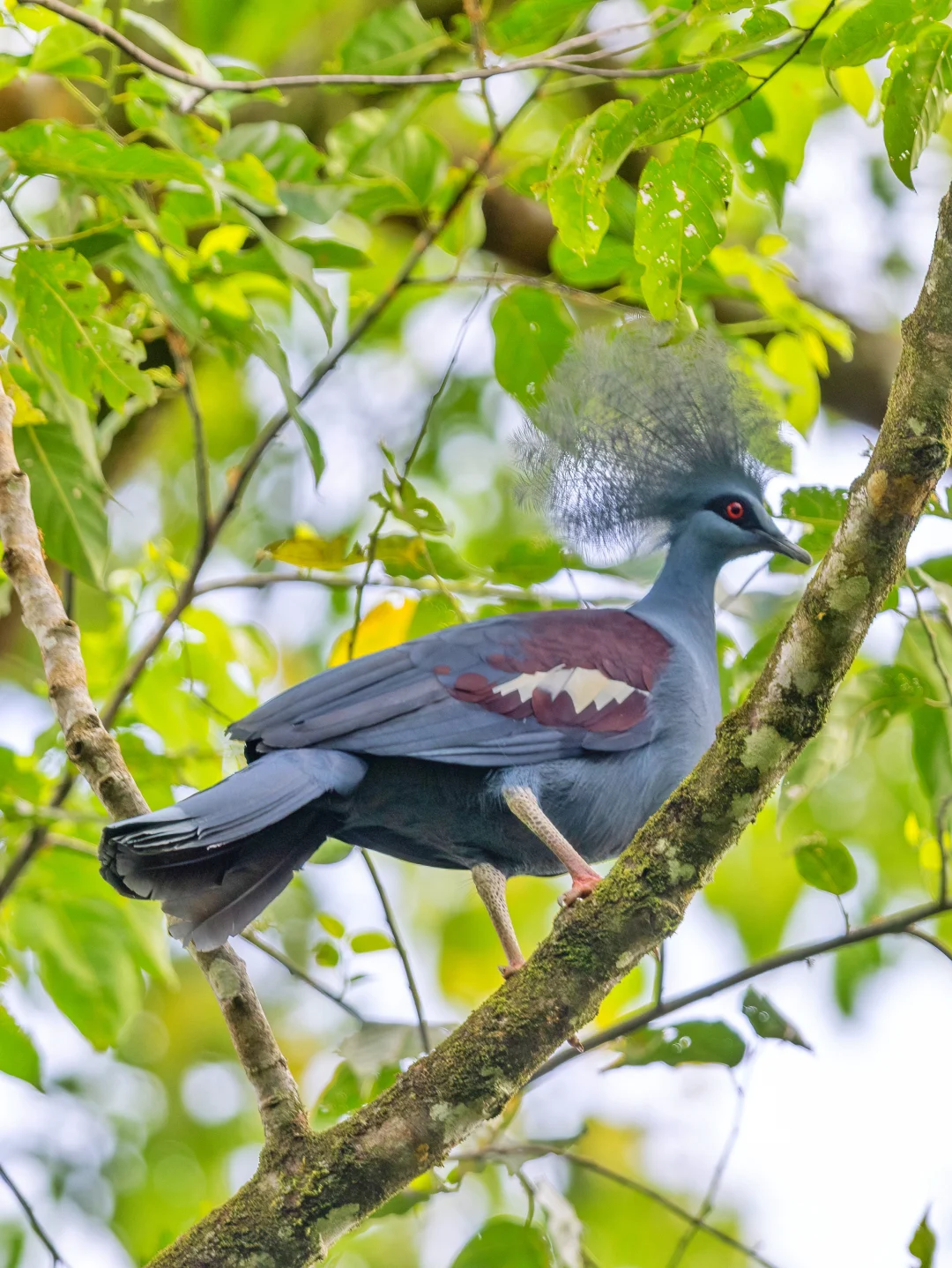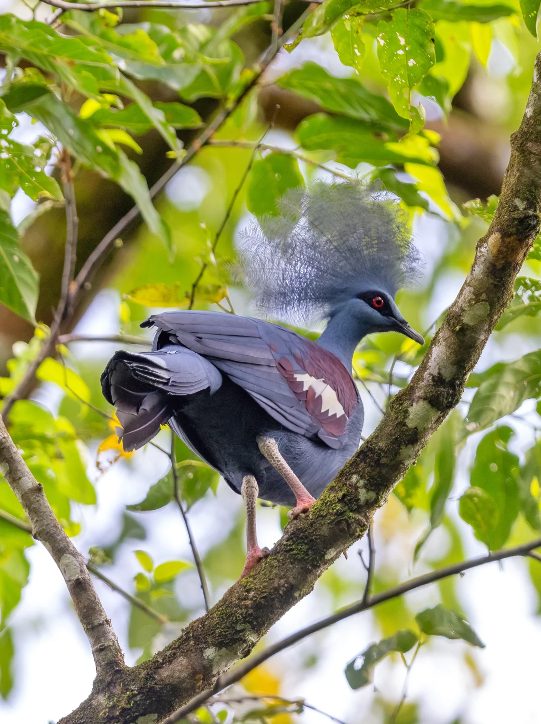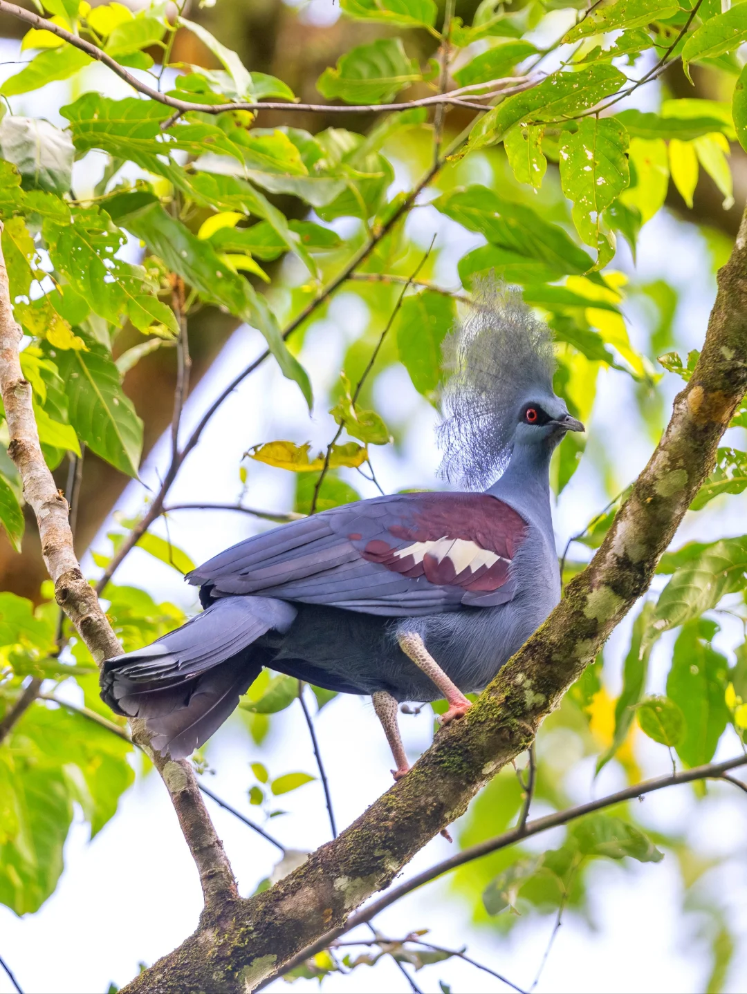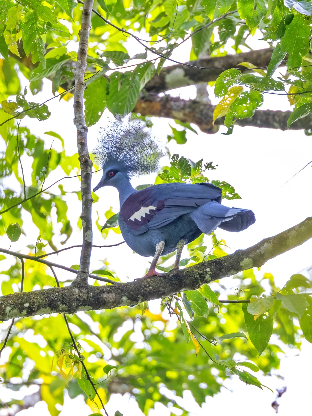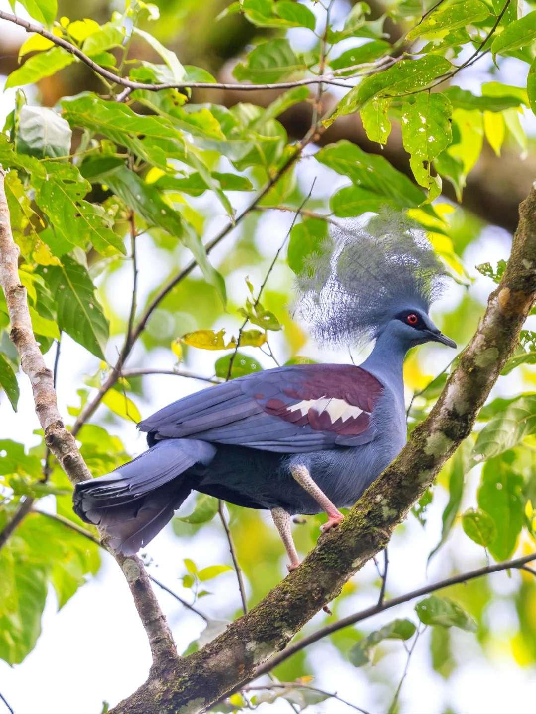 蓝凤冠鸠整体呈现中至深灰蓝色调,头上有侧压的蓝灰色蕾丝状羽毛组成的冠羽,带银色光泽。背部和大部分翼覆羽为暗紫红色。虹膜红色,喙黑色,腿和脚为深红色。与其他凤冠鸠的区别在于缺乏胸部的紫红色,且拥有独特的白色肩部斑点。非常华丽,看一眼就迷住了。也不知道这么华丽的头饰在这种密林里起到什么作用,可能起到一个造型上的作用....🤣