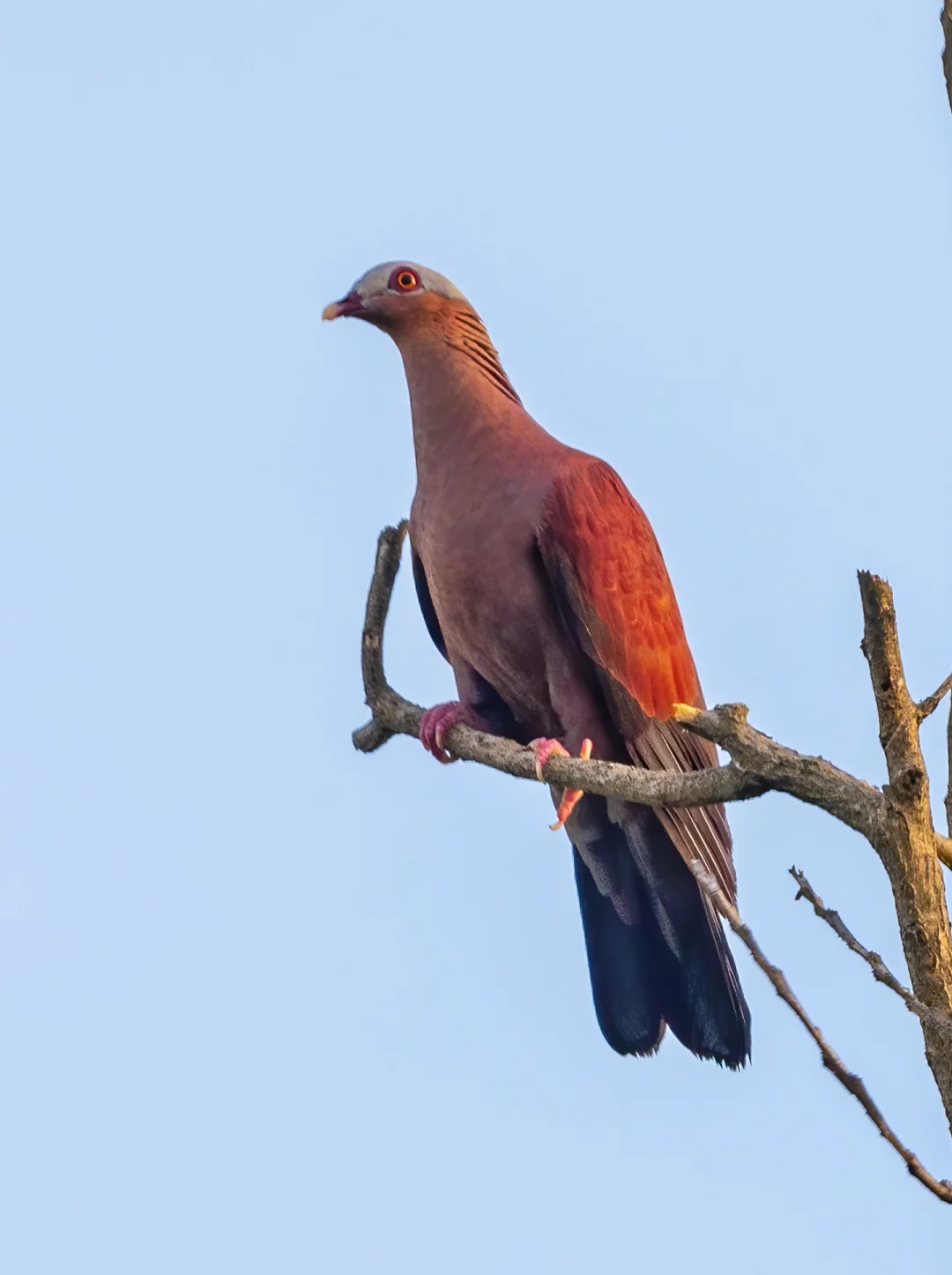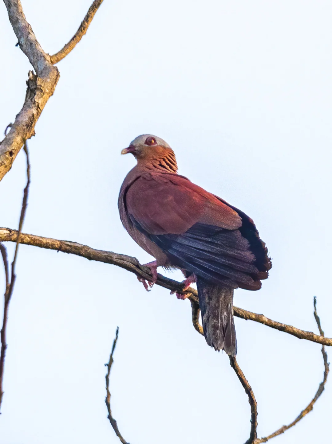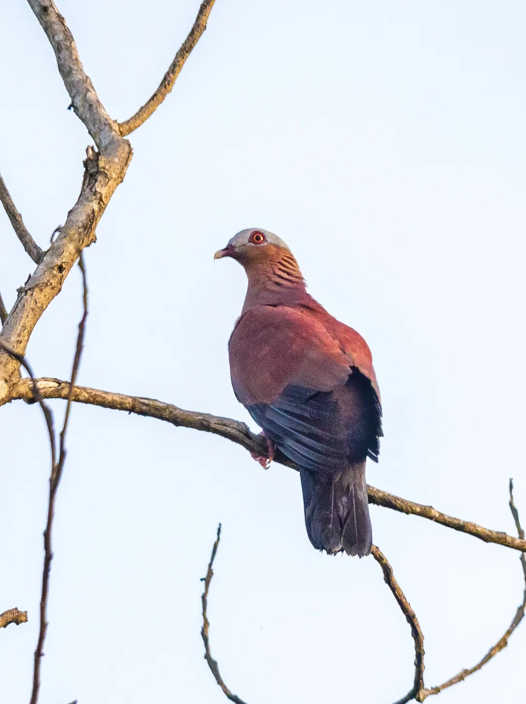 紫林鸽是数量稀少的一种鸽子,主要的分布在东南亚缅甸和印度,在我国的记录非常少,只有在海南岛和西藏南部的非常少的区域有记录,而且在我国很长一段时间内都没有记录了。今年四五月份在海南岛的番加保护区,发现了一个繁殖的种群,吸引了国内好多鸟友过去。之前没时间去,没想到还呆的时间比较长啊,可能到9月都还在吧,于是这个月赶去记录了一下,真开心。