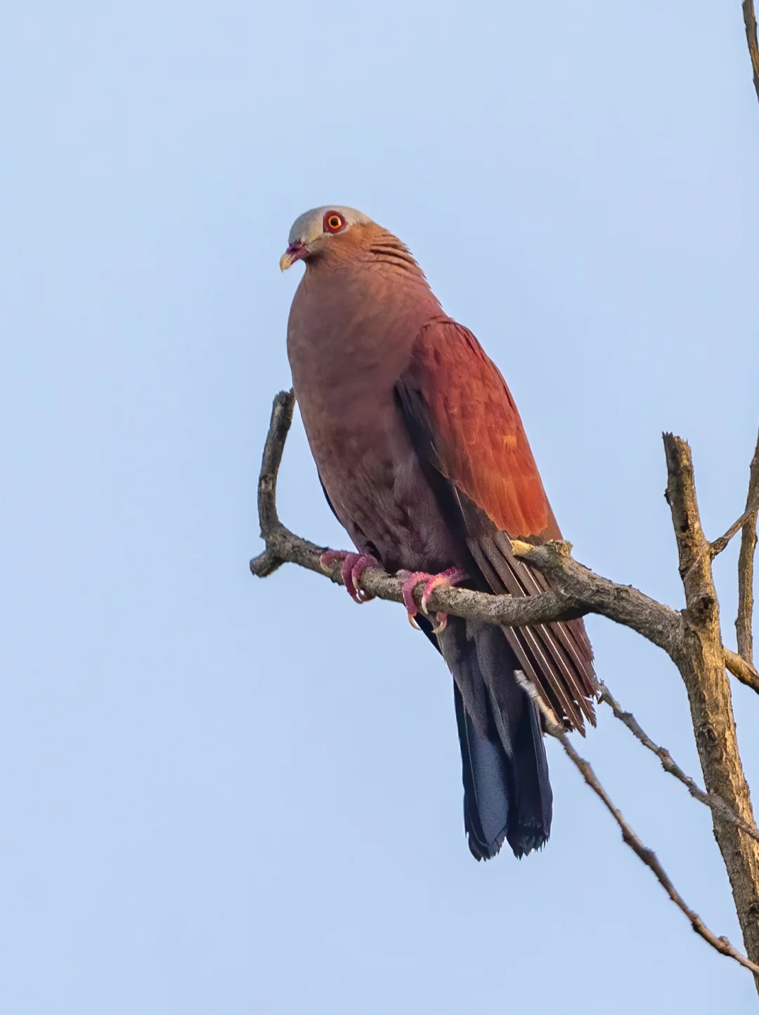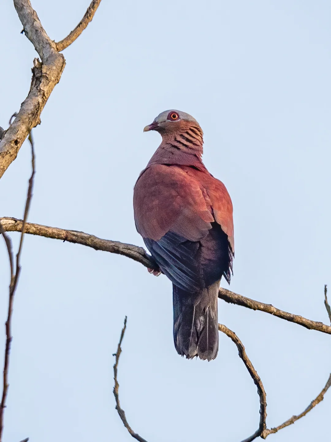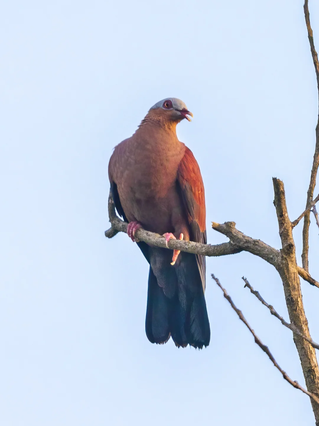 紫林鸽是数量稀少的一种鸽子,主要的分布在东南亚缅甸和印度,在我国的记录非常少,只有在海南岛和西藏南部的非常少的区域有记录,而且在我国很长一段时间内都没有记录了。今年四五月份在海南岛的番加保护区,发现了一个繁殖的种群,吸引了国内好多鸟友过去。之前没时间去,没想到还呆的时间比较长啊,可能到9月都还在吧,于是这个月赶去记录了一下,真开心。