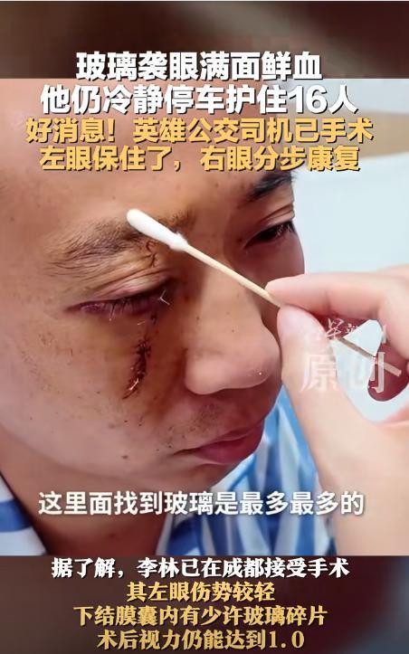 近日,四川仁寿公交驾驶员李林,在行车时遭遇意外,双目受伤,流血加上疼痛,让他根本睁不开眼睛,但是,危急时刻,李林忍住眼睛的剧痛,努力保持车身平稳,把公交车停在安全区域,保护了全车乘客安全,而乘客的举动,却让网友们集体破防!网友:双向奔赴的善良! 李林是一名公交车司机,从年轻时就开始在这条线路上工作,到如今已经几十年了,这条线路熟悉得就像自家后院一样。 在路上,无论遇到突发情况,他总能泰然自若。遇到突然闯红灯的私家车,他能稳稳地踩刹车,灵活调整方向盘。 遇到乘客突发疾病,他会第一时间安抚情绪,同时拨打急救电话,快速将车停在安全位置,几十年的经验,让他养成了冷静而果断的应对习惯。 那天,李林依旧像往常一样,精神饱满地坐在驾驶座上,公交车正在路上照常跑着,没想到毫无征兆地,一块长约一米的钢筋“嗖”地从高处坠下,以迅雷不及掩耳之势砸向车头。 “砰!”的一声巨响,前挡风玻璃瞬间被击穿,裂纹像蛛网一样疯狂蔓延,下一秒,成千上万颗碎玻璃渣像子弹一样迸射出来,狠狠地扎进了他的双眼。 一阵剧烈的疼痛让他瞬间眼前一黑,李林并没有立刻松开油门或者撒手,他几乎是凭借几十年的驾驶经验和肌肉记忆,在眼睛失明的情况下,强忍剧痛,稳稳把车往路边靠。 车速逐渐降了下来,车身轻轻晃动,却始终没有失控,终于,在距离前方路口不到二十米的地方,公交车缓缓停下,乘客们这才反应过来,意外发生了。 车上的乘客没有一哄而散。他们围了过来,前排一位阿姨赶紧拿出纸巾,为他按住流血的伤口。有年轻的乘客立刻拨打了120。 被送到医院后,李林的第一句话,问的不是自己的眼睛怎么样了,而是“乘客转运了没有?车子摆正了没?”在他心里,人和公司的财产,都还悬着。 这起事件很快被央视新闻报道,无数网友被深深打动。 有人表示:天啊,这得多疼,得多能忍啊,救了一车的人,功德无量啊! 目前,警方已介入调查那块钢筋的来源,公司也承诺会全力负责李林的治疗,我们祝愿这位平凡英雄能早日康复。 信息来源:红星新闻