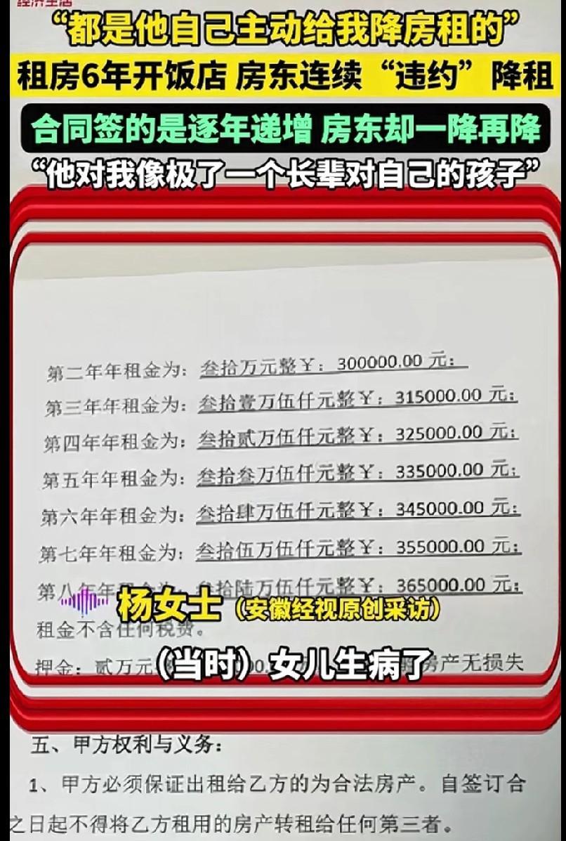 房东多次违约,不是涨房租而是降房租。杨女士说她2019年租的房子开饭店,签的是8年的合同,合同上写明房租每年递增,第一年房租是30万,每年递增,第8年是36.5万元。 麻烦各位读者点一下右上角的“关注”,留下您的精彩评论与大家一同探讨!感谢您的强烈支持! 据AHTV第一时间9月25日报道,在安徽合肥的一条街上,有一家开了6年的饭店。 老板娘杨女士的手机里保存着一条特殊的“违约通知”:“明年房租再减2万,我就赔26万。” 这条消息来自她的房东,而这份“违约”,已是6年来的第四次。 2019年,杨女士签下8年租约时,合同白纸黑字写着“租金逐年递增”。 从第一年的30万到第八年的36.5万。 然而,万万没想到的是,这份冷冰冰的契约,后来竟被房东用温情“撕毁”。 起初,房东发现杨女士的女儿发育迟缓,每月康复治疗开销不小。 没过几天,他主动上门,直接免除了合同里8年的递增租金,省下7.5万元。 “这钱对我影响不大,但孩子治病不能耽误。”房东一句话让杨女士当场红了眼眶。 2020年疫情暴发,饭店被迫停业,杨女士正发愁如何开口。 没曾想房东的电话先来了:“丫头,降2万房租,等熬过去再说!” 去年经济寒潮下,他又将年租从31万砍到28万,理由朴素却通透:“租出去总比空着强,你好我才能好。” 前几日饭桌上,他轻描淡写再降2万,定格在26万。 六年里,房东的每次让步都是主动出击,从未等杨女士开口。 如今他来吃饭,像长辈般聊聊家常,对租金只字不提。 杨女士感慨:“他像疼孩子的长辈,是我的贵人。” 网友看后直呼是上辈子修来的福气。 还有网友表示怎么自己遇不到这样的房东,之前的房东合同到期涨租30%,一句商量余地都没有。 但也有类似情况的网友:“疫情时我开店亏本,房东免了一个月房租,至今记得那份温暖。” 其实,说到底合同是规矩,人心是温度,房东让一步,租客更珍惜,这才是双赢。 在网友看来,现在房租普降,但主动为租客孩子生病降租?属实少之又少。 而房东的此等举动和市场无关,是骨子里的善良。 网友更是直言:“这样的房东像大熊猫,建议纳入‘珍稀物种保护名单’!” 更难得的是,房东用“拟亲缘关系”打破了租赁市场的冰冷博弈。 当《民法典》第533条的“情势变更原则”为协商变更留了窗,现实中却鲜有人愿推开门。 合肥房东的选择提醒我们:商业社会的底色,未必打着算盘,也可以是雪中炭火的暖响。