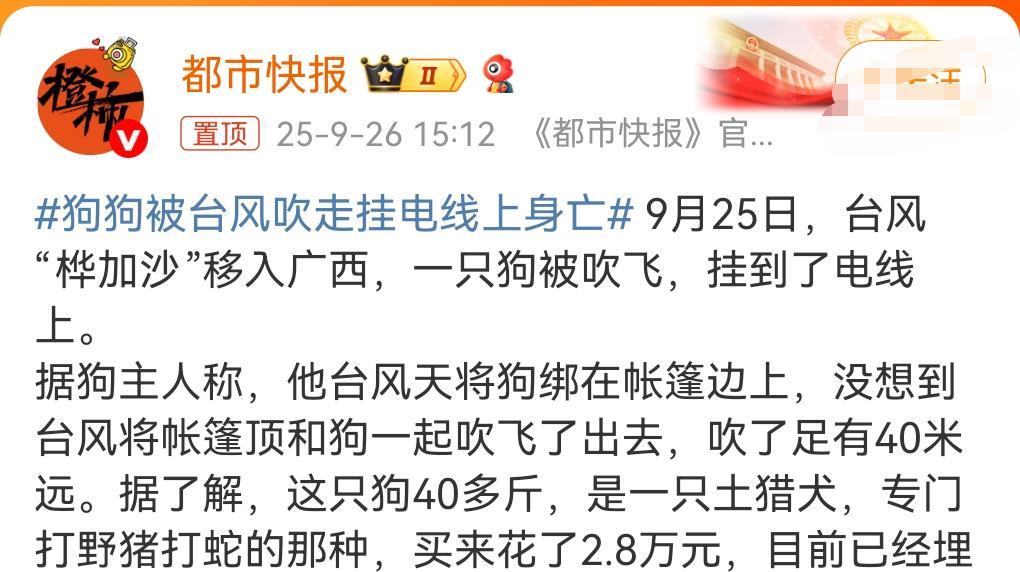 台风真的是太可怕了。 9月25日,狗狗被台风吹走挂电线上身亡。 想不到台风的威力竟然这么大。 竟能把40多斤狗吹上电线。 当时主人把帐篷和狗绑在一起。 没想到发生这样的悲剧。