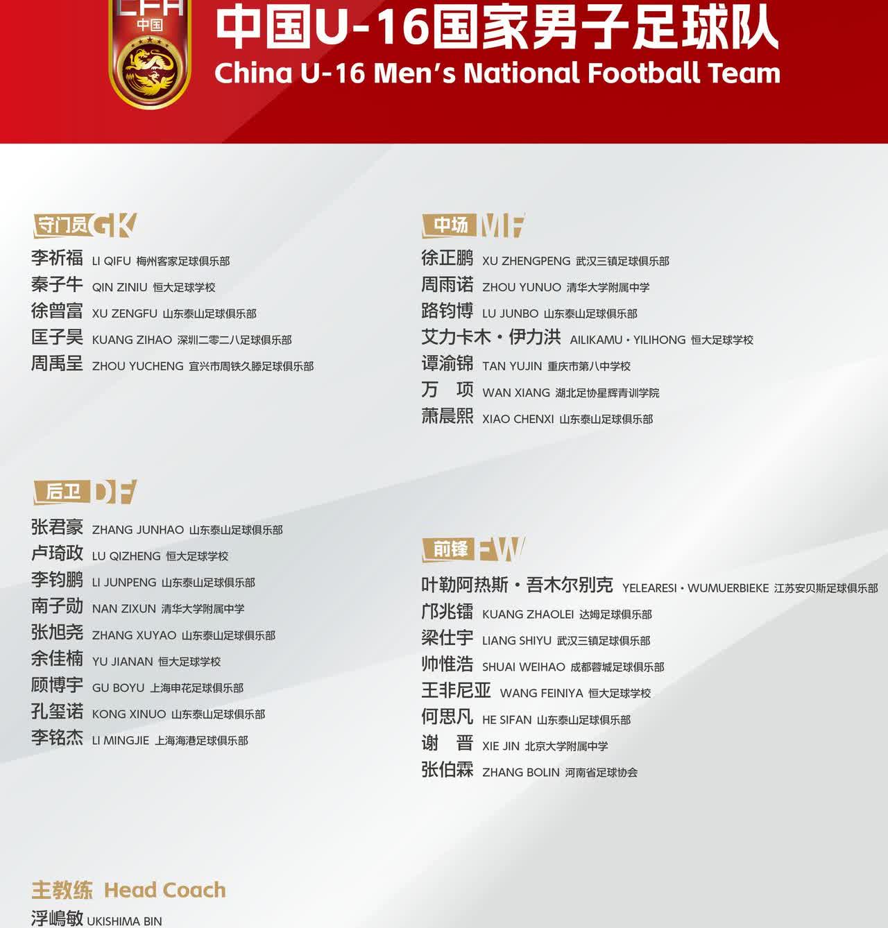U17国少队公布最新大名单,与沈阳和平杯时候的大名单相比,这支国少队大变动,首先是在西班牙留洋球员邝兆镭,万项,谢缙都没有征召,但是招入了在克罗地亚留洋的金昱成。 其次后防线主力大闸卢琦政,因个人作风原因确认告别国字号,看样子是真的被弃用了,着实可惜。 第三,前锋线上,混血球员王非尼亚,高中锋张伯霖也没有入选。 这支国少队的冲击力相较于和平杯,下降了不少。日本人浮岛敏这么自信吗?还是大名单里又有什么猫腻? 图1为本次大名单,图2为和平杯时期大名单。