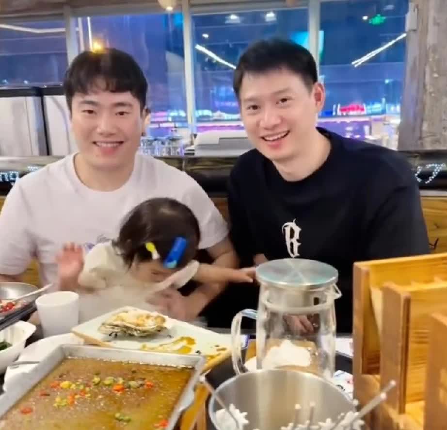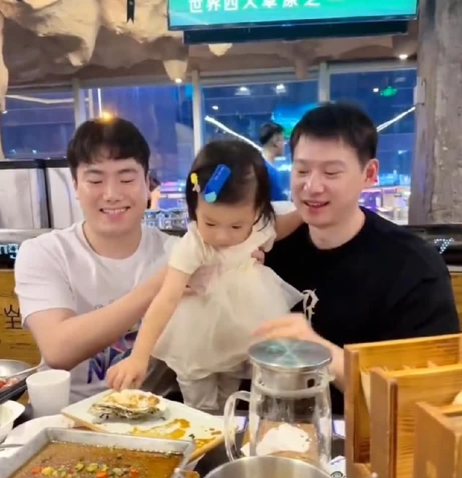 国乒名将梁靖崑与国乒退役队员周雨聚餐! 周雨带着自己女儿和梁靖崑一同合照!两人