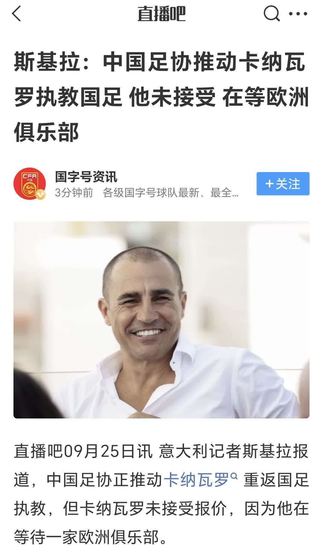 落花有意,流水无情。看来让卡纳瓦罗执教中国国家队的希望也要泡汤了!据意大利知名记者斯基拉报道,卡纳瓦罗并未接受中国足协的报价,他正在等待一家欧洲俱乐部的邀请函。 其实说句实在话,卡纳瓦罗并不是中国国家队主教练的最优选择,但至少已知的9个报名的教练中,他其实是一个靠谱的选项。毕竟卡纳瓦罗熟悉中国足球,也比较年轻。唯一的缺点是除了带领当年的广州恒大拿了冠军,在欧洲的执教成绩确实拉胯。 那么问题来了,现在卡纳瓦罗也退出了竞争,那么谁将执教中国国家队成为了问题?选来选去,不会真的选郑智当中国国家队主教练吧!