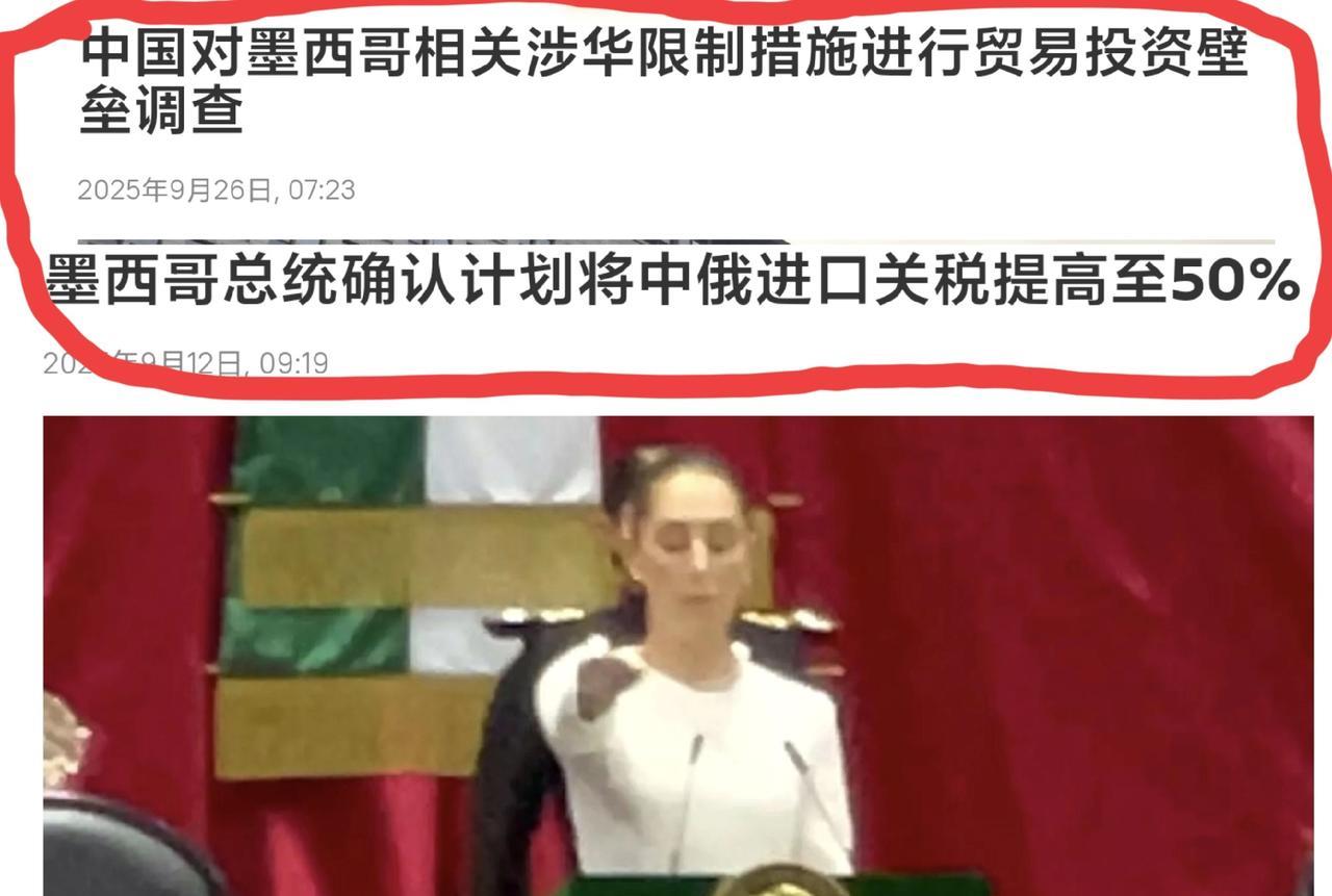 墨西哥不听劝,中国只能出手反制:中国商务部决定自2025年9月25日起对墨西哥相关涉华限制措施启动贸易投资壁垒调查。 墨西哥此举是在向美国表忠心,是在为寻求美国关税的照顾而损害中方的利益,中国早就说过了,任何国家为寻求美国关税豁免而损害中方利益的国家,中国将按法律处理! 中国商务部决定自2025年9月25日起对墨西哥相关涉华限制措施启动贸易投资壁垒调查。 调查对象包括具体涉及汽车及零部件、纺织品、服装、塑料、钢铁、家电、铝、玩具、家具、鞋类、皮具、纸及纸板、摩托车、玻璃等产品类别。此外,墨西哥近年来采取的其他涉及中国的贸易投资限制措施也在本次调查范围内。 消息称,本案应当自立案决定公告之日起6个月内结束,特殊情况下可以延长,但延长期不得超过3个月。 如今看来,中方对墨西哥的调查是从 9 月 25 日开始,而墨西哥对中国征加关税是从 2026 年开始,所以还有 2 个月的时间留给墨西哥思考。如果在这两个月内,墨西哥不解除对中国的单边加征关税,中国必将对等对墨西哥加征关税! 墨西哥拟对中国加征关税包括中国的汽车、玩具、钢铁、纺织品和塑料制品等约1400项税目产品的进口关税税率提升至10%至50%。中方已向墨西哥表达关切,希望墨方三思后行,不要被掉到美国的圈套里面了!如果墨方一条道走到黑,最终损失的就是墨西哥,当然中国在墨的利益也会带来受损! 从目前 美加墨自由协定的条约来看,加拿大正饱受油菜籽子滞销之苦,正是回为加拿大不公平的对中国征加关税,而美国也受大豆滞销之困,美国豆农们表示如果大豆卖不出去将彻底击毁豆农们的生活。而如今墨西哥也为了向美国表忠心,将对中国征加关税,相信 加大拿油菜籽及美国豆农们的痛苦能引起墨西哥总统反思!不要轻易对中国下手,否则留给墨西哥也只剩下痛苦!这不是威胁,而是公平对待!