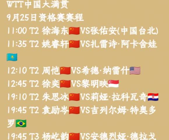 WTT北京大满贯首个比赛日迎来开门红 北京时间2025年9月25日,北京大满贯资格赛正式开打 徐海东剃光头 在揭幕战的较量中,男单国乒选手徐海东以3-0横扫中国台北选手张佑安,三局比分(11-5、11-6、13-11),为国乒取得门前首胜! 杨屹韵狂轰11-1 国乒女单杨屹韵也紧随其后,3-0战胜哈萨克斯坦名将阿卡舍娃。三局比分(11-1、11-9、11-1) 2025WTT 中国大满贯,共有33 名国乒选手参赛,这次赛事奖金共 1460 万元还有最高 2000 点奥运积分。 国乒这次共派出 10 名选手参加资格赛,其中男单 5 人包括:徐海东、袁励岑、李和宸、周恺、陈俊菘、女单 5 人包括杨屹韵、朱思冰、徐奕、朱梓予、 赛程安排: 本次赛事,9 月 25 日至 27 日的资格赛阶段,全部在二号馆进行比赛,共分为两个场次——上午 11 点和晚上 的18 点开始。 9 月 28 日正赛开启后,混双决赛率在 10 月 1 日 ,男双、女双冠军分别在 10月3 日、10月4 日产生,男单和女单决赛则是在10 月 5 日进行角逐。