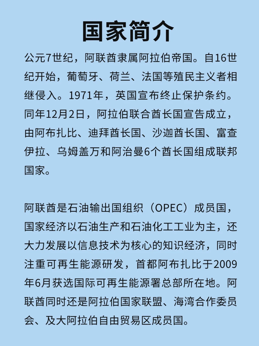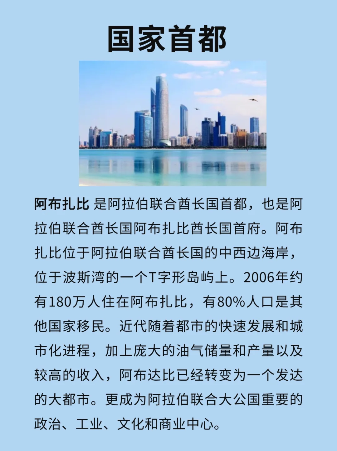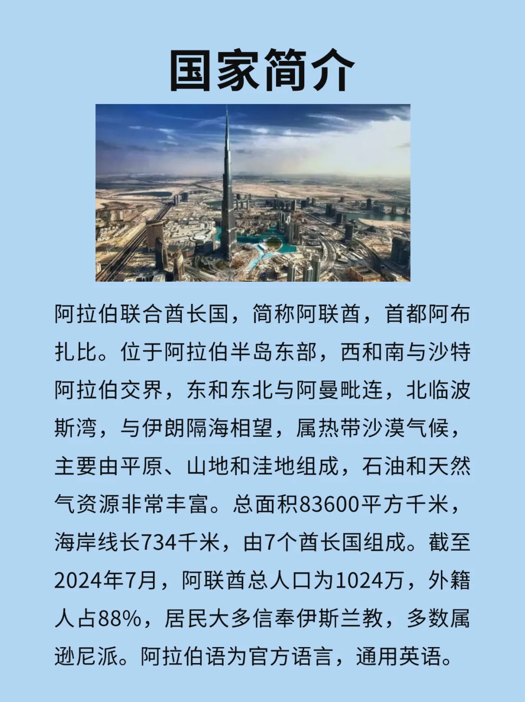 [打卡R]阿拉伯联合酋长国,简称阿联酋,首都阿布扎比。位于阿拉伯半岛东部,西和南与沙特阿拉伯交界,东和东北与阿曼毗连,北临波斯湾,与伊朗隔海相望,属热带沙漠气候主要由平原、山地和洼地组成,石油和天然气资源非常丰富。 [向右R]总面积83600平方千米海岸线长734千米,由7个酋长国组成。截至2024年7月,阿联酋总人口为1024万,外籍人占88%,居民大多信奉伊斯兰教,多数属逊尼派。阿拉伯语为官方语言,通用英语。