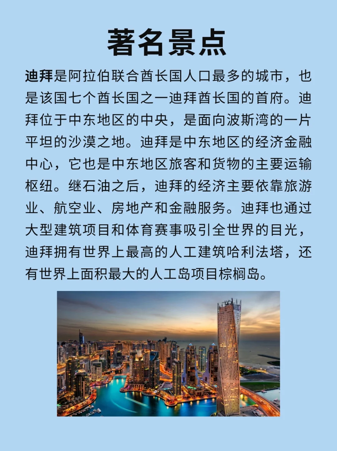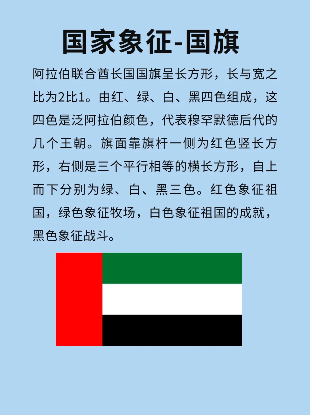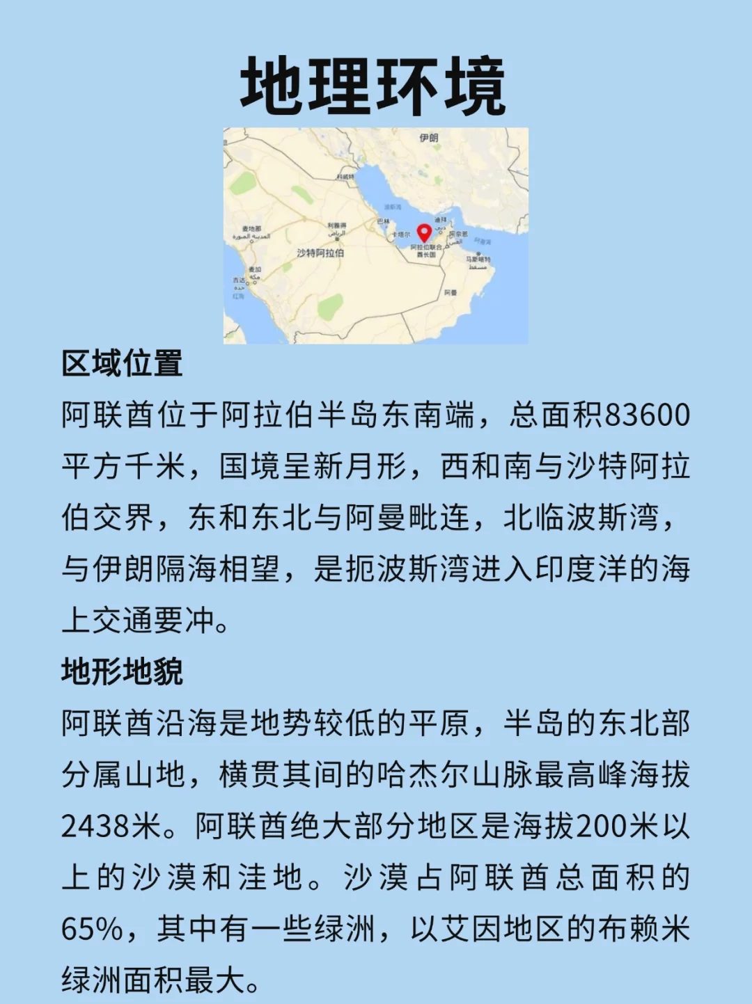 [打卡R]阿拉伯联合酋长国,简称阿联酋,首都阿布扎比。位于阿拉伯半岛东部,西和南与沙特阿拉伯交界,东和东北与阿曼毗连,北临波斯湾,与伊朗隔海相望,属热带沙漠气候主要由平原、山地和洼地组成,石油和天然气资源非常丰富。 [向右R]总面积83600平方千米海岸线长734千米,由7个酋长国组成。截至2024年7月,阿联酋总人口为1024万,外籍人占88%,居民大多信奉伊斯兰教,多数属逊尼派。阿拉伯语为官方语言,通用英语。