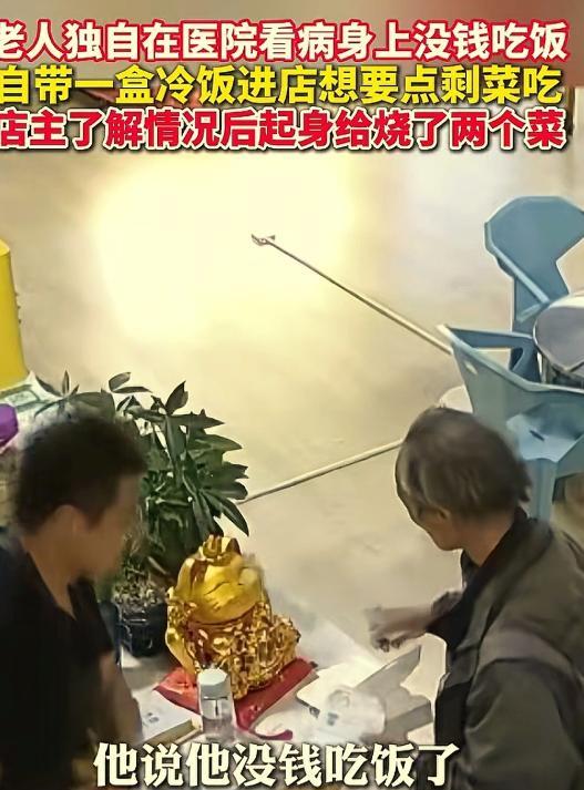 “这是真的饿了。”近日,云南昭通,一位老人自带一盒冷饭来到饭店,请求给点剩菜。店主一家本以为是乞讨者或骗子,愣了好一会。结果老人突然拿出病历:“我真的没钱了,一天都没吃饭了。”男子看了心里很不是滋味,让老人坐在旁边等一会他去拿菜,可当菜端上来时,老人差点红了眼眶。 老大爷张福林(化名)已经七十出头了,身子骨瘦弱,背微微驼着,走起路来步履蹒跚。他住在县城郊外一间简陋的出租屋里,屋里光线昏暗,只有一张小床和一口老旧的煤气灶。 房间角落堆着一些洗得发黄的衣物和几只破旧饭盒——那是他生活的全部财产。 几年前,张福林的女儿因病去世,留下他独自一人在世上漂泊。原本依靠女儿的照顾,他还能勉强维持日子,但女儿走了之后,他的生活一落千丈。 亲戚不多,也都忙于自己的生活,偶尔来看他的人,也只是送一些零散的生活用品,真正能帮他解决温饱问题的人几乎没有。 老大爷患有慢性胃病和高血压,每个月都得去县医院复查。自从女儿去世后,他一个人去医院,拿药、挂号、排队,全都自己来,几乎没有人陪伴。 有时因为药费紧张,他甚至要几天不吃饭,只靠着水和一点咸菜将就维持。寒冬里,他会蜷缩在被子里,手里紧握着病历,心里默默祈祷自己能撑过去。 这天,老大爷再次拎着破旧饭盒出门。天刚蒙蒙亮,他便沿着泥泞的街道一路走到县城中心的医院。看着医院里熙熙攘攘的人群,他忍不住咽了咽口水。 早餐根本吃不起,医院的小卖部里贵得让人咂舌的一包豆浆,他只能望着看别人拿着吃。 复查结束后,他拖着疲惫的身子沿街走回去。胃里空空如也,肚子咕咕作响,连走路都显得有些蹒跚。心里盘算着今天晚饭该怎么办——他实在没钱去买热菜。 手里的饭盒里只有昨晚剩下的一小团冷饭,如果能有点菜配着吃,他至少能撑到明天。 他推开了饭店的玻璃门。 小心翼翼地走到柜台前,低声对老板说:“师傅,我……能不能给我打点剩菜?我有饭,就缺点菜。” 这句话让在场的人愣住了。平日里确实也有乞讨者上门,但像这样自带冷饭只求剩菜的,还是头一回遇到。老板娘皱了皱眉头,心里闪过一丝怀疑:会不会是骗子?现在社会上什么样的人都有。 老人看出了他们的迟疑,连忙抖嗦地从怀里摸出几张皱巴巴的纸。展开一看,竟是一份医院的病历,上面写着密密麻麻的诊断和药物处方。 老人声音有些颤抖:“我不是骗人,我是真的没钱了。一天都没吃东西了,饿得实在受不住了。” 说完这话,他低下头,似乎有些羞愧。 男子——也就是饭店老板,这才反应过来,心头突然涌起一阵酸楚。 他看着老人布满老茧的手、干裂的嘴唇,忽然觉得自己心口发紧。于是,他赶紧说道:“大爷,您先坐下歇会儿,我马上给您弄点菜去。” 他转身进了厨房,没有像老人说的那样随便打点剩菜,而是特意现炒了两道热腾腾的家常菜:一盘清炒时蔬,一盘回锅肉。 老大爷看着端上来的菜,双手微微发抖,几乎要落泪。他的手指因长期劳累而粗糙发硬,但仍紧紧握着饭盒,仿佛怕一松手,温暖就会溜走。 可老大爷并没有在店里吃,他低声说:“我在这里吃,怕弄脏你们的店铺……能帮我打包吗?” 店主心里一酸,他点了点头,把菜打包好递给老人。随后,他随口问了一句:“大爷,您孩子呢?” 老大爷整个人像被戳中痛处,哽咽良久,才断断续续说:“我……我就一个女儿。她……她得了病,没了……”声音越说越哽,他抬起手轻轻抹了抹眼角,泪水顺着皱纹滑落。 店主忍不住拍了拍老人的肩膀:“大爷,看病期间没饭吃就来我这儿,我一天免费给您两顿饭。”