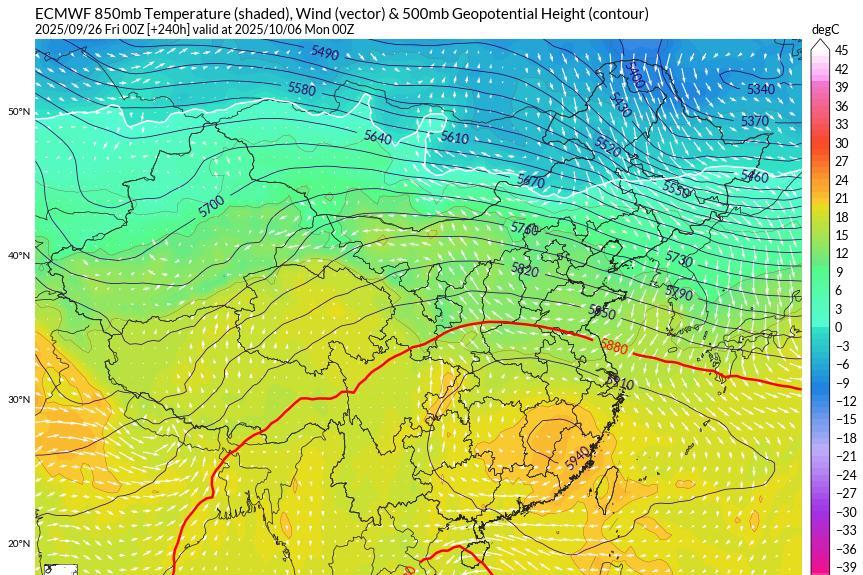 副高你别卷了!国庆假期南方地区可能有大范围炎热天气 国庆假期即将到来,目前来看,国庆假期前半段没有台风影响我国,全国天气总体稳定,需要重点留意副高增强导致的南方地区大范围炎热天气。 最新的数值预报认为,9月末到10月上旬,副高仍然偏强,591将覆盖南方大部分地区,甚至594也将覆盖南方部分地区,华中地区南部、华东地区南部、华南地区东部可能有大范围炎热天气,出行游玩需注意防暑降温。