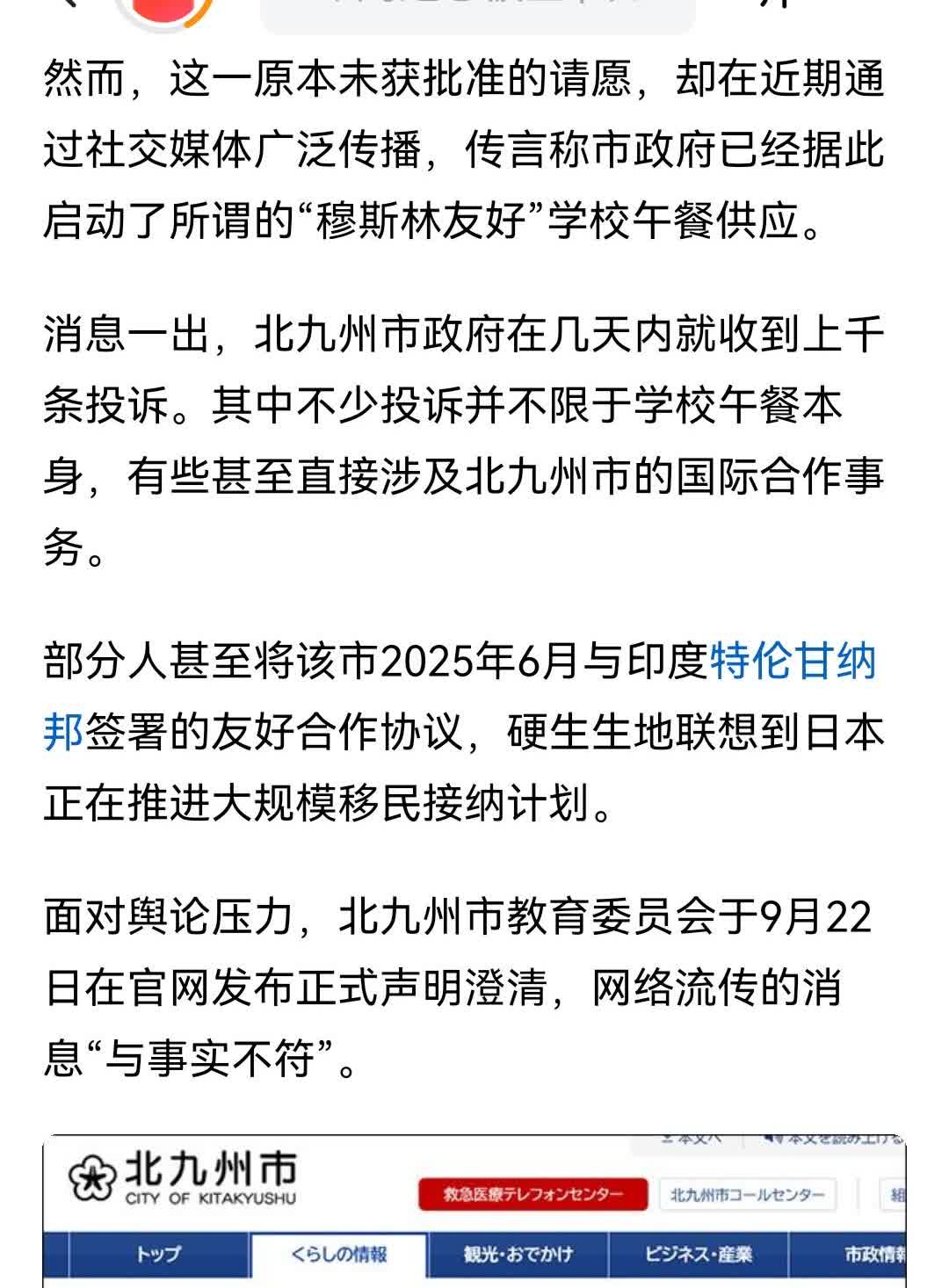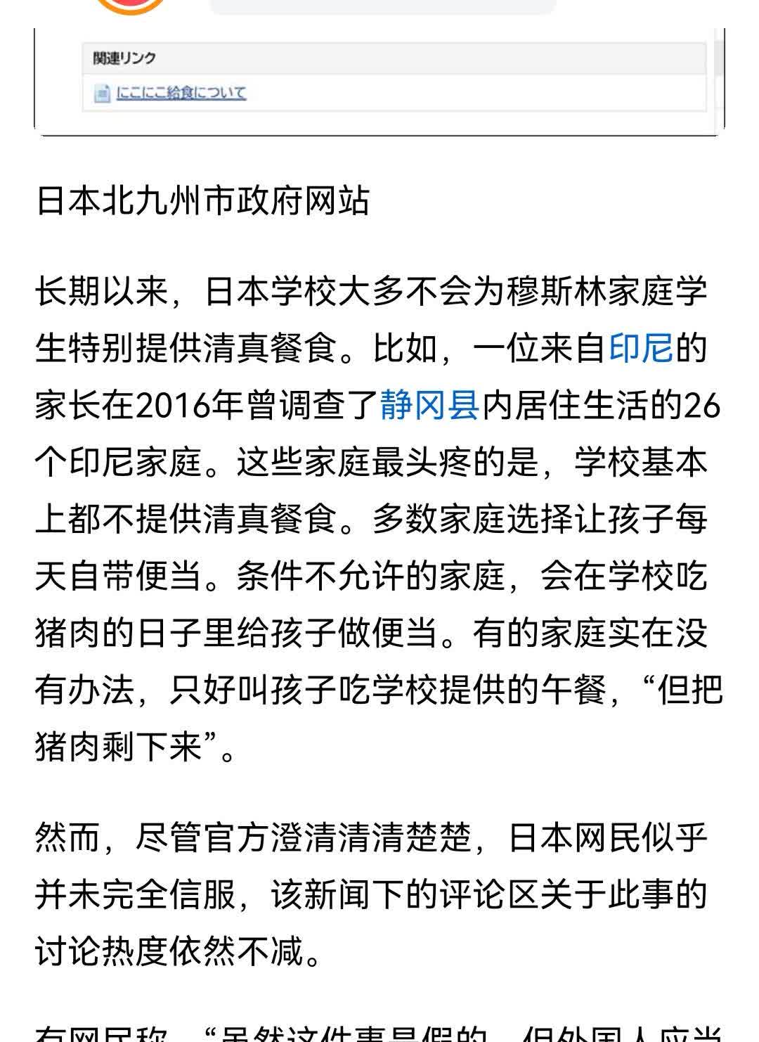 日本坚决不给穆斯林学生提供清真食物, 北九州有个阿富汗妈妈请愿,想让孩子在学校吃到不含猪肉的午餐。 传言一扩散,政府几天就收了上千条投诉,日本只能赶紧发声明说“不提供,与事实不符”。 这主要是没这个普遍需求和操作基础。首先穆斯林人口被控制的太少了,占全国1.3亿人的零头都不到,学校里有需求的学生更是寥寥无几。 再者日本学校午餐叫“给食”,核心是统一配餐、培养集体感,全班同吃一样的饭是惯例,还承载着食育教育。要搞清真餐得单独采购认证食材、弄专用厨具,成本高还麻烦,不符合统一供餐的制度。 就像日本网民说的“入乡随俗”,默认有特殊需求的家庭自己带便当,之前很多的那个请愿也没批下来,政府还特意澄清了特供传言,本质是少数需求没到要改变整体制度的程度。
