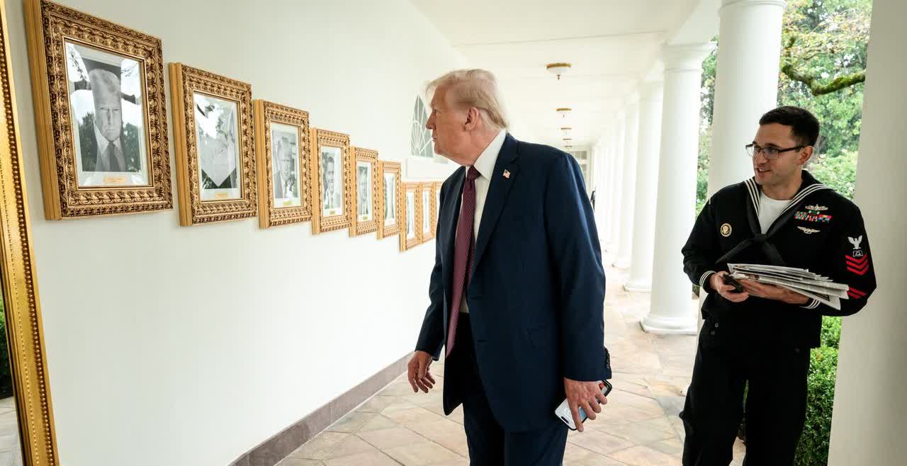 白宫更新了历任总统画像,将拜登总统画像改成了一个自动签字笔。特朗普还到白宫走廊好