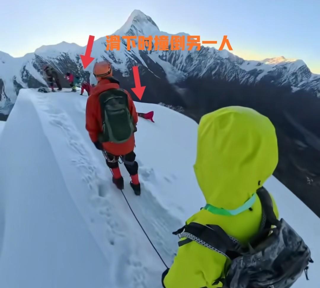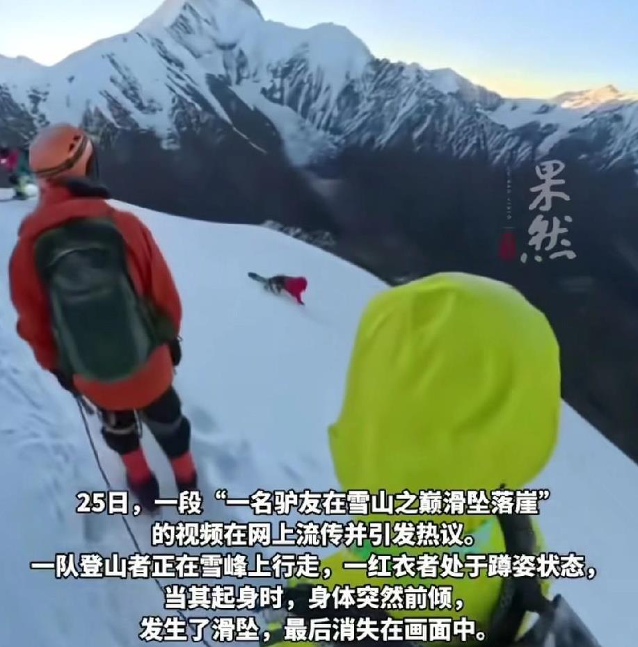 四川雪山滑坠落崖者已确认死亡,她蹲着拍照起身时发生意外,曾尝试自救失败,手里连副冰镐都没有! 事情发生在9月25日的康定那玛峰雪山,据当地文旅局工作人员回应,事发地不是景区,处于未开放状态,登山者们没有报备就偷偷上去,结果不幸发生意外。 从视频看,在一处雪山顶,稍微平坦的地方,两侧都是陡峭的悬崖,几个人在山顶休息拍照,后面还有几名登山者牵着绳子,小心翼翼前行。 坠崖者原本是蹲在地上的,起身时重心不稳,身体前倾,一个滋溜便俯趴着滑了下去。过程中疑似撞到身前一名队友,那人连忙半跪着趴下稳住身体,才没有一同滑坠。 整个雪面光滑如镜,那人嘴里不停呼救,手脚并用尝试着爬起来自救,但均以失败告终,众人眼睁睁看着他坠入深谷崖底。 有网友指责,旁观的同伴们都太过冷漠,眼看别人滑倒,只是在那里呆呆看着,一点营救措施都没有。 其实这样说,真的是强人所难了!一来事发突然,众人根本来不及准备;二来高山雪面、坡陡崖深,稍微一动都有可能滑倒,没有任何固定措施,谁敢有大幅度动作去救人呢? 也有人认为,那人自救方式有误,如果在滑坠过程中,将脚和手用力撑入雪里,就能刹住车,保住一命。 这样想也太天真!雪山上的雪不像冬天刚下的雪那么松软,白天太阳融化,晚上重新凝结,如此反复多次,整个雪面会变得非常坚硬,这一点从她滑下后没留下明显痕迹可以证明。 这样的姿势和速度,光靠手脚是无法撑入雪里的,必须借助相应工具,比如专门破冰用的冰镐,用力来一下,那倒有刹住的可能,可惜那人两手空空,连副冰镐都没有。 无限风光在险峰,大自然的确有很多神奇之处,但我们在探险领略时,一定要心怀敬畏之心,小心翼翼保证自身安全。不然,哪怕是任何一个不起眼的小疏忽,都可能让你万劫不复…… 【关注@小讼言案 ,为您分享更多精彩】 (来源:果然视频)