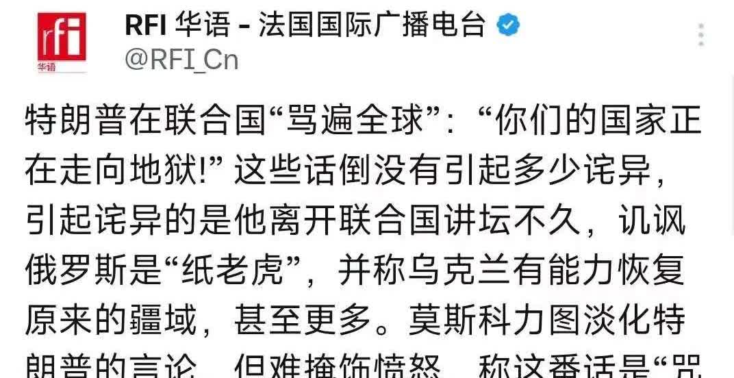 9月25日,法广台发文:“特朗普在联大骂遍全球:你们的国家正在走向地狱!这些话没