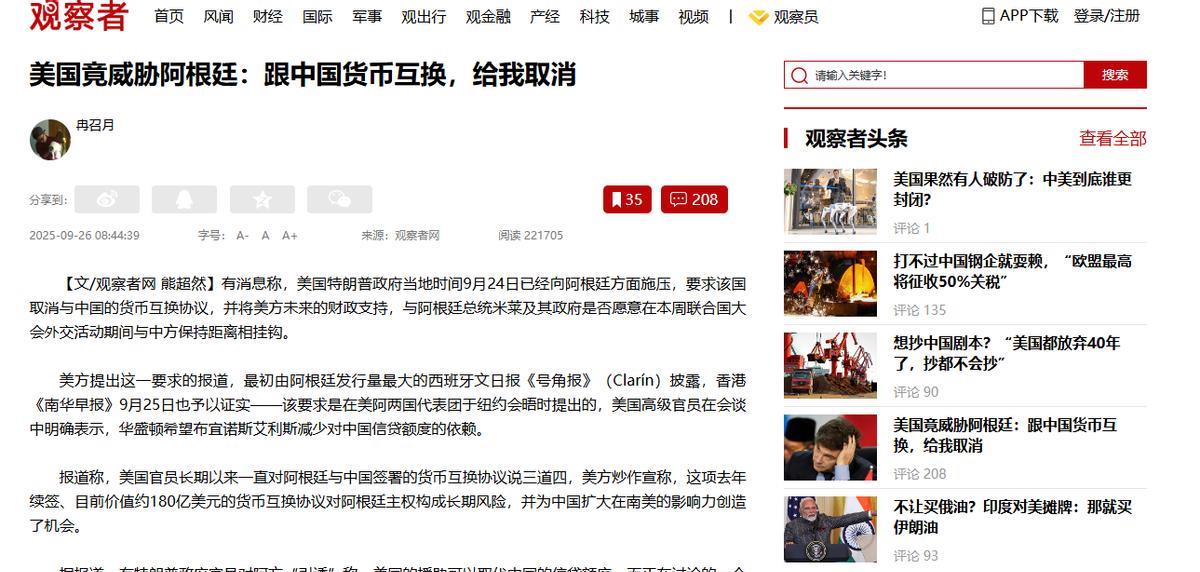 美国也太横了!居然拿援助当要挟,硬逼阿根廷撕了跟中国的货币互换协议,放话“不取消就别想拿钱”,这哪是援助,纯纯是霸权勒索! 美国特朗普政府最近这操作,真是霸道到没边了!直接找阿根廷施压,把话撂得明明白白:想拿美国的钱救急? 行,但得先办俩事 —— 一是把跟中国签的货币互换协议撕了,二是联合国大会期间离中国远点,这哪是帮忙,分明是拿好处当诱饵,用威胁逼人家选边站,霸权嘴脸太难看了! 可这货币互换协议,对阿根廷来说就是救命稻草,它经济早烂透了,外汇储备快见底,物价涨得离谱,商店标价都得用粉笔写,方便随时改。 跟中国的协议,不管是稳住外汇、付进口货款,还是还到期债务,都得靠它撑着。 之前续签的协议值 180 亿美元,今年又续了部分额度,中方是真金白银帮它渡难关,阿根廷自己都承认这协议是 “经济稳定的关键”。 美国倒好,见不得中阿合作顺利,早早就开始找茬,一会儿说这协议是中国 “坑” 阿根廷,一会儿威胁要断了它向 IMF 贷款的路。 现在更直接,抛出 200 亿美元援助当诱饵,可这钱是带钩子的 —— 拿了就得听美国的,跟中国翻脸。 美国财长还装样子说 “会考虑各种稳定办法”,说白了就是 “不跟中国切割,你就别想拿到钱”,算盘打得震天响! 美国这么上蹿下跳,根本不是为了帮阿根廷,就是怕中国在拉美站稳脚跟。 这些年中国跟拉美国家合作,从来都是平等互利,不搞弯弯绕,可美国一直把拉美当自己 “后花园”,见不得别人跟中国走近,想借阿根廷的手打压中国,保住自己的霸权。 再看阿根廷总统米莱,之前竞选时还嘴硬说不跟中国合作,结果当选后立马务实起来,说 “不跟中国合作会害了阿根廷”。 可现在美国把钱摆出来当条件,他夹在中间也难 —— 一边是急需的救命钱,一边是真能帮他稳经济的中国伙伴,这两难境地,全是美国逼出来的! 最可笑的是美国还装好人,说什么 “帮阿根廷稳经济”,其实满肚子算计。 它以前最讨厌给别的国家 “输血”,现在为了拉拢米莱、打压中国,连自己的老规矩都破了,把钱和政治条件绑死,这不是勒索是什么? 中国早说了,中阿合作不针对任何人,也不该被干扰,谁在搞事,全世界都看得明白。 美国这就是霸权惯了,见不得别人跟中国好好合作。 可现在早不是美国说了算的时代了,阿根廷要是为了眼前这点钱,丢了中国这个靠谱伙伴,最后亏的还是自己。 希望它能拎清楚,别被美国的威胁和诱饵忽悠了!