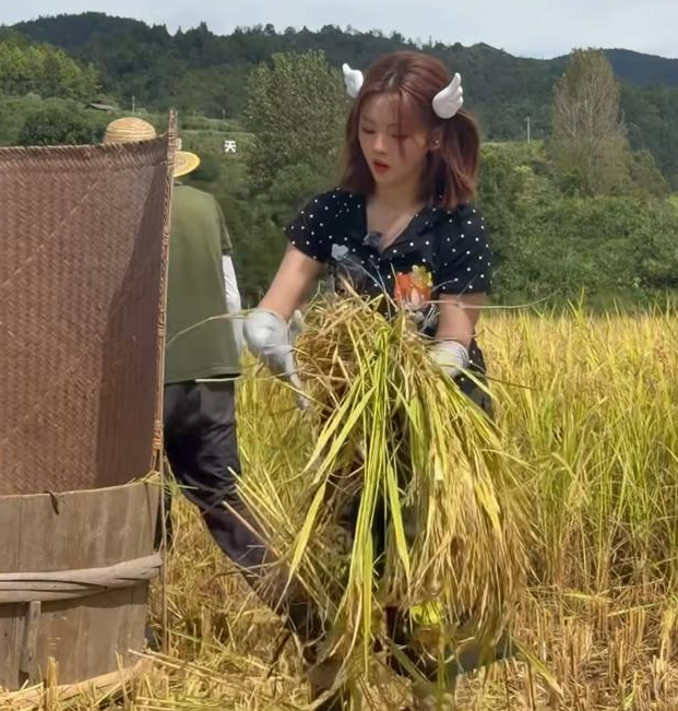 别的明星去打谷子,多是摆拍或者作秀。 而杨超越完全不同, 在综艺节目里她打谷子的姿势非常熟练:抬手轻扬、下手有力,打完还会低头检查稻秆,发现有没掉干净的谷粒还要补几下,一点没有明星的架子,就像村里从小干惯农活的姑娘。