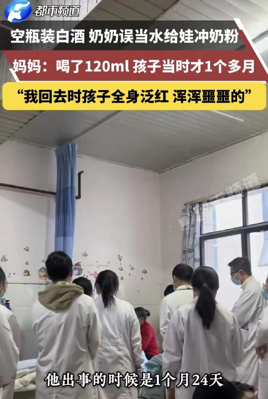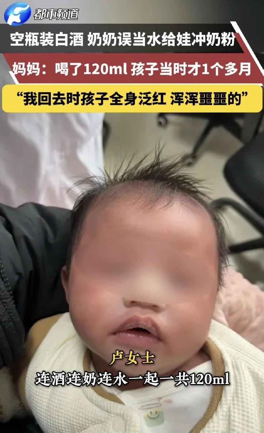 孩子奶奶用白酒当成水给孩子冲奶粉,儿媳妇讲述,自家孩子冲泡奶粉都是用纯净水冲 泡,家里人用矿泉水空瓶装白酒,奶奶不知道,奶奶以为是纯净水,就给孩子冲泡了奶粉,水和白酒,再加上奶粉大约在120毫升,给婴儿喝了下去,12点多,孩子没有反应,浑身泛红,浑浑噩噩,奶奶也没和儿媳妇说,到了4点多才告诉儿媳妇,儿媳妇知道后紧急送医,还好来的及时救治,出事的时候孩子刚出生一个月零二十四天,现在孩子已经九个月大了,现在情况感觉良好,没什么不良反应,以后可能还要做全面检查,不留遗憾。 白酒那么大味,看不出来,鼻子也不好吗?幸亏孩子没出事,不然又毁了2个家庭。有很多农村老太太进城后就是整个是懵的,连生活常识都没有。孩子奶奶不适合带孩子赶紧让她回老家吧!