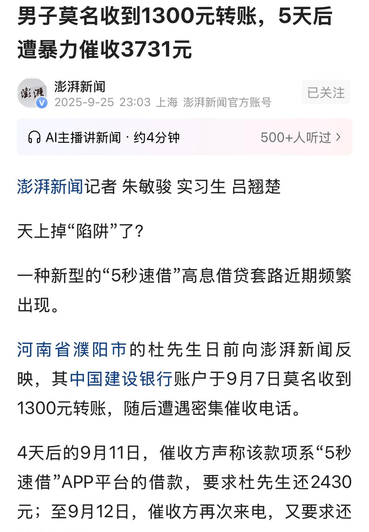 河南濮阳,一男子账户突然收到1300元转账,并且转账方男子不认识,男子意识到不对劲,报了警。岂料,没等警方查清,催收电话就打来了,对方称男子在“5秒借贷”APP上借了1300元钱,让他赶紧还2430元!被男子拒绝了。对方哪肯善罢甘休,第二天,又打来电话,还款金额直接滚到3731元。还威胁男子不:还钱就别想过消停日子,亲朋好友也跟着遭殃。男子不是软柿子,任人拿捏,直接找来媒体曝光此事。 近日,杜先杜先生就因为账户里突然多的1300元,好好的日子被搞得鸡犬不宁。 事儿得从9月7号说起,那天杜先生打开手机银行,突然发现多了一笔1300块的转账。 杜先生心细如发,赶紧仔细查看了一下付款人是个叫杨爽的人。 杜先生认真回忆了一下,自己身边的亲朋好友并无此人。 杜先生防范意意识很强,认为天上掉馅饼不是阴谋就是陷阱,绝非是好事。 随后,他赶紧联系银行,客服让他直接报警,他不敢耽搁,马上报了警,本以为等警察调查就行,没想到这才是麻烦的开始。 4天后,也就是9月11号,陌生电话开始疯狂轰炸杜先生的手机。 一接起来,对方就凶巴巴地说:你在“5秒速借”APP借了钱,该还了! 杜先生一头雾水,自己连这APP听都没听过,咋就借钱了? 可对方不管这些,直接甩了个还款金额:2430块! 这就离谱了,1300块钱才拿了4天,就要还2430,等于一天要多还280多块,这不就是明摆着的高利贷吗? 杜先生当然不认可,说自己已经报警了,结果对方更横,不仅辱骂他,还让他加联系方式,被拒绝后也没罢休。 更夸张的是,转天也就是9月12号,催收电话又打来了,这次的还款金额直接涨到了3731元。 短短一天时间,又多了1300多块的利息,还威胁说要是不还,就别想过安稳日子,亲朋好友也跟着遭殃。 好好的日子突然被催收缠上,杜先生自己也犯嘀咕:难不成是不小心点了啥非法链接,泄露了个人信息?他绞尽脑汁也想不起来了。 无奈之下,杜先生寻求媒体帮助。 记者了解到杜先生的情况后,也觉得此事有蹊跷。 为了弄清楚真相,记者拨通了杜先生提供的催收电话号码,打了过去。 对方很快接通了电话,电话那头自称是“5秒速借”的工作人员,一口咬定是杜先生自愿借的钱,他们是正规借贷。 同时,坚称杜先生是自己点击过短信广告链接,自愿完成了人脸认证,并提交的5天借贷。 可当记者要求出示杜先生借款的证据时,对方又拿却以保护客户隐私为由,拒绝提供。 在记者的再三追问下,对方渐渐失去了耐性,竟直接承认,这就是高利贷。 甚至还威胁起记者:你也敢打电话?为了新闻什么都不怕是吧?我们之所以借钱给他?肯定有原因。 最后撂下狠话:我们有专门的催收人员,这是肯定的!想不还钱,门都没有! 记者还查了一下催收电话,发现根本就不是正规公司会用的官方号码。 同时,发现不管是在手机应用市场搜,还是在网上查,都找不到“5秒速借”公司的任何正规信息,更没有工商注册记录,也就是说这“5秒速借!”绝非正规借款平台。 无独有偶,记者在网上一查,今年4月、5月就有不少网友投诉过类似的情况,跟杜先生的遭遇几乎如出一辙。 目前,警方以介入调查。 那么,在法律的角度,该如何认定此事呢? 《关于办理非法放贷刑事案件若干问题的意见》第一条规定,违反国家规定,未经监管部门批准,或者超越经营范围,以营利为目的,经常性地向社会不特定对象发放贷款,扰乱金融市场秩序,情节严重的,依照刑法第225条第(四)项的规定,以非法经营罪定罪处罚。 “5秒速借”平台没有工商注册记录,属于未经监管部门批准从事放贷业务,且从网上投诉情况来看,该平台可能存在经常性地向社会不特定对象发放贷款的行为,其行为可能构成非法放贷。 《刑法(2023修正)》第274条规定:敲诈勒索公私财物,数额较大或者多次敲诈勒索的,处三年以下有期徒刑、拘役或者管制,并处或者单处罚金;数额巨大或者有其他严重情节的,处三年以上十年以下有期徒刑,并处罚金;数额特别巨大或者有其他特别严重情节的,处十年以上有期徒刑,并处罚金。 杜先生根本没有办理过借贷,对方用非法手段获得杜先生的个人信息,再往其账户上打钱,试图获得高额利息,被杜先生拒绝后,又进行电话轰炸、辱骂、威胁等行为,符合敲诈勒索的构成要件,因数额较大应追究刑事责任。 这事给大家提了个醒:天上不会掉馅饼,更不会掉“免费的钱”!平时手机上弹出的不明链接、陌生短信里的借款广告,千万别随便点;填写个人信息、做人脸认证的时候,一定要看清楚对方是谁,是不是正规平台。