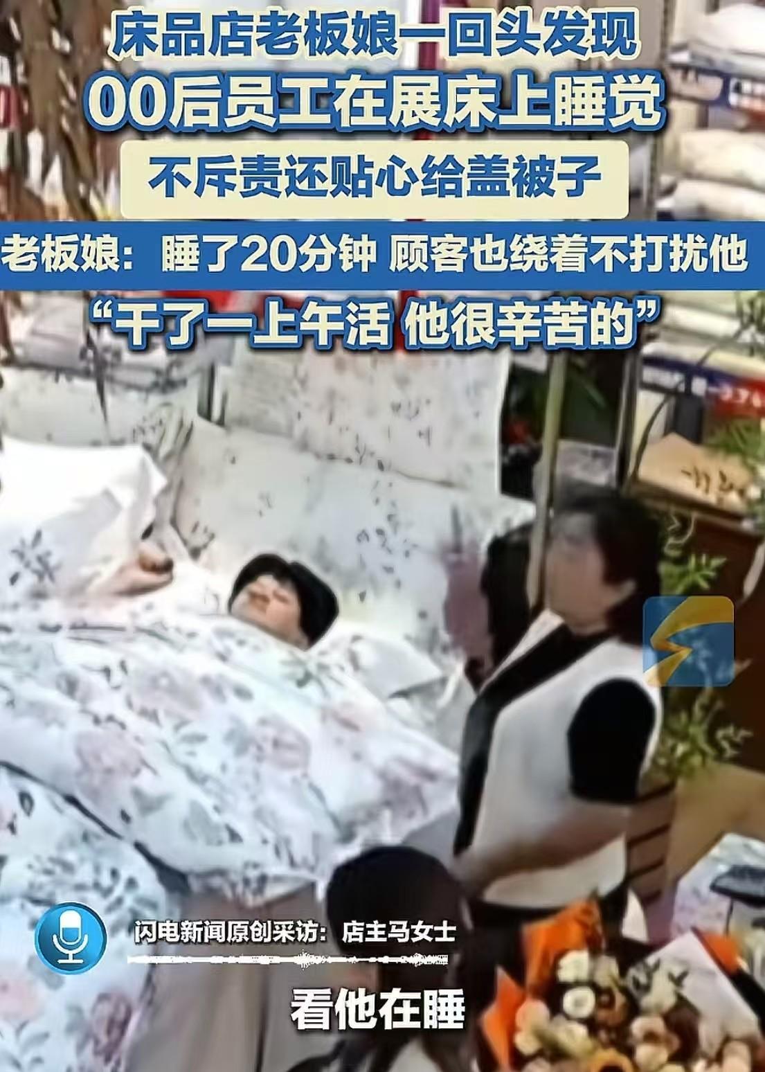 笑不活了!00后小伙去床品店上班,居然躺在展床上睡着了!老板娘发现后,一番举动令人暖心!网友:说明床品舒服,活广告! 小伙干活干累了,疲惫感就像潮水一般将他淹没。他看到店里有床,心里想着:“就躺一小会儿,休息休息。” 结果,刚一躺下,困意就如决堤的洪水般袭来,他直接进入了甜甜的梦乡。 老板娘回头发现小伙睡着了,要是换做有些老板,估计早就火冒三丈,指责员工上班偷懒了。 可这位老板娘不仅没生气,反而轻手轻脚地走过去,小心翼翼地给小伙盖上了被子,生怕惊扰了他的美梦。 期间,有客户走进店里,一眼就看到了躺在展床上睡觉的小伙。 但是大家都很自觉,没有上前打扰,而是默默地绕开,去挑选别的床品了。 大约过了20多分钟,小伙自己悠悠转醒。他一睁眼,就看到了身上盖着的被子,心里顿时涌起一股疑惑。 等他从其他同事口中得知是老板娘给他盖的被子时,又感动又愧疚! 感动的是老板娘如此体贴入微,愧疚的是自己上班期间竟然睡着了。 后来,老板娘接受采访时,说了一番特别暖心的话:“他是我们店里的理货员,上午一直在忙忙碌碌地干活,特别辛苦。我自己也是个母亲,要是我自己的孩子在外面这么辛苦,往那一躺都能睡着,我肯定会心疼得不行。” 此事引发了热议,有网友说, 刚好可以跟客户介绍,你看我们家的家纺多好,睡的多香! 也有网友说,老板这是知道他干了一上午活,而不是啥活不干就可以躺的,这点要区别开来!要是从头到尾都不认真工作,估计就是另外一个故事了吧, 还有网友说,有些商家 真的活该发财!不像我老板,我干了一下午的活,坐那抽根烟被他看到,都能数落我偷懒! 不得不说,这样的老板就像他们店里温暖舒适的床上用品一样,浑身散发着让人安心的温度。 在我看来,这简直就是最好的宣传。床品的作用是什么?不就是让人能舒舒服服地睡觉吗? 小伙睡得那么香,这不就是在用最真实、最生动的方式告诉大家,他们家的床品质量杠杠的,舒适度爆表! 这才是真正的“活广告”,比那些天花乱坠的宣传语有用多了!