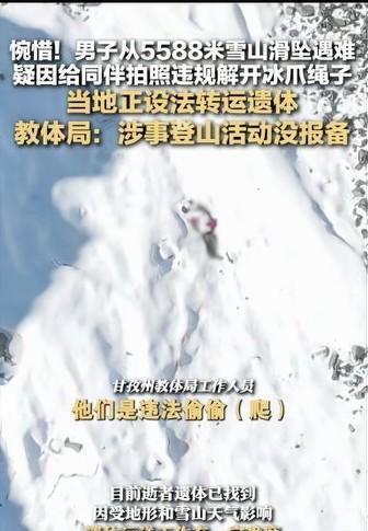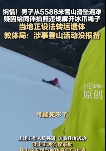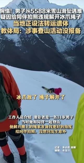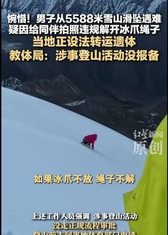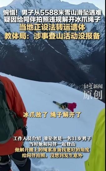 生死瞬间,悲哉。 给同伴拍照,为了更好的角度擅自解开冰爪绳子,脚底没有站稳,滑下冰坡摔下悬崖。 雪山极限探险,潜在风险随时可能发生,珍爱生命,敬畏自然。#生命脆弱瞬间# #瞬间定格生命# #冒险瞬间#