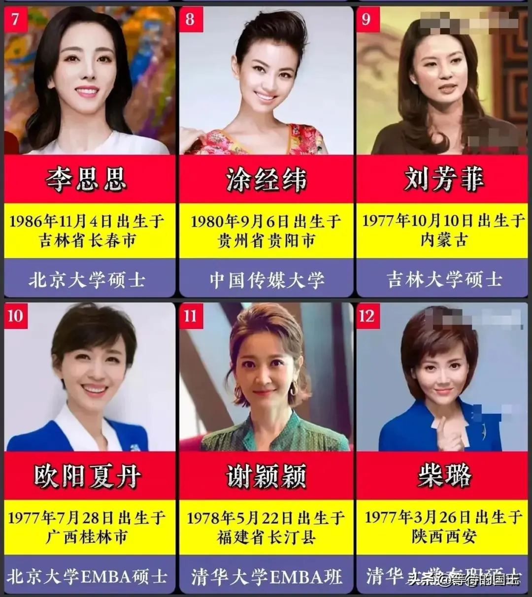 位列前三位的是李红、蝴蝶、龙阳。4-6位是:朱迅、周涛、董卿。你最喜欢哪一位呢? 值得一提的是位列第五的周涛,他是12位美女中年龄最大的一位,出生于1968年,毕业于中国传媒大学,硕士研究生学历。在2008年曾主持北京奥运会开幕式,曾担任全国妇联常委、全国青联常委等多个重要职务。可谓是家喻户晓,美貌与智慧并存的人物。