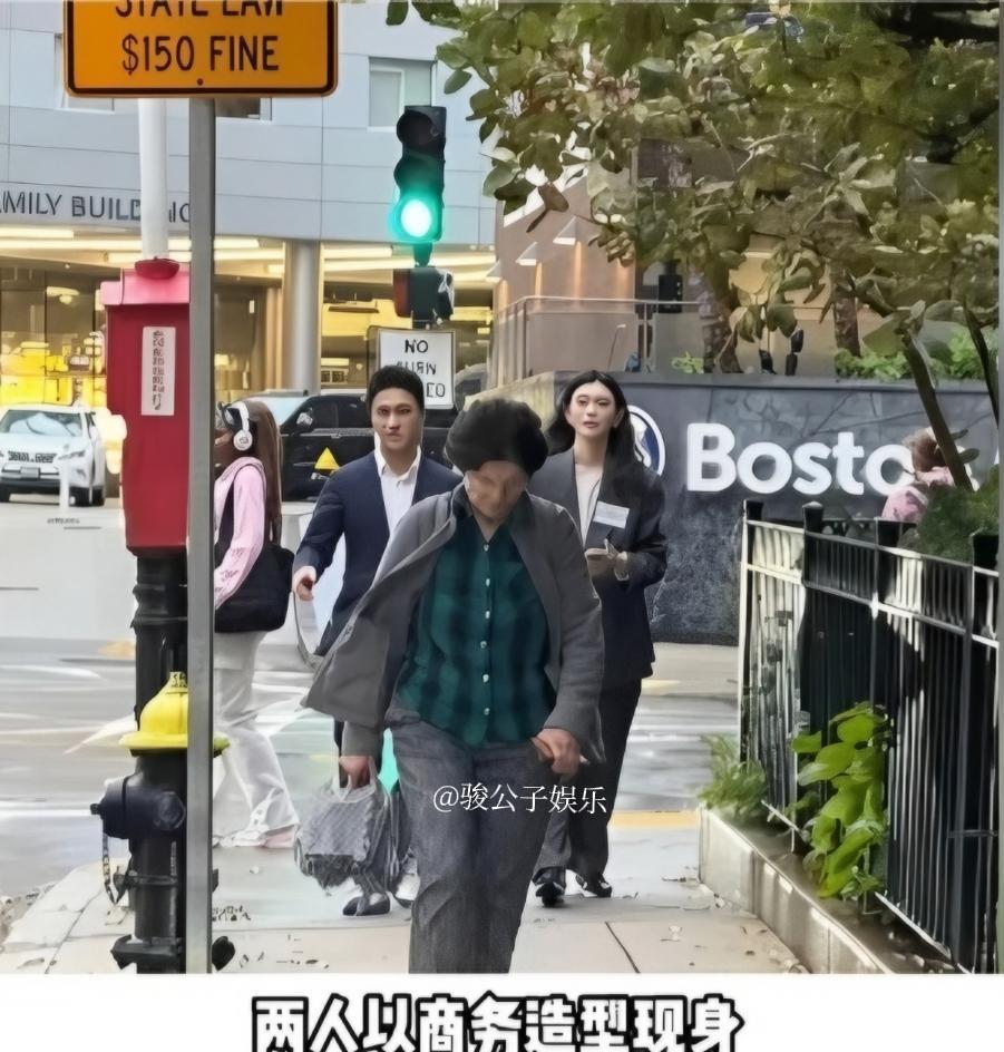 9月26日,有网友在波士顿医院门口偶遇何猷君与奚梦瑶夫妇,两人一身商务精英装扮,