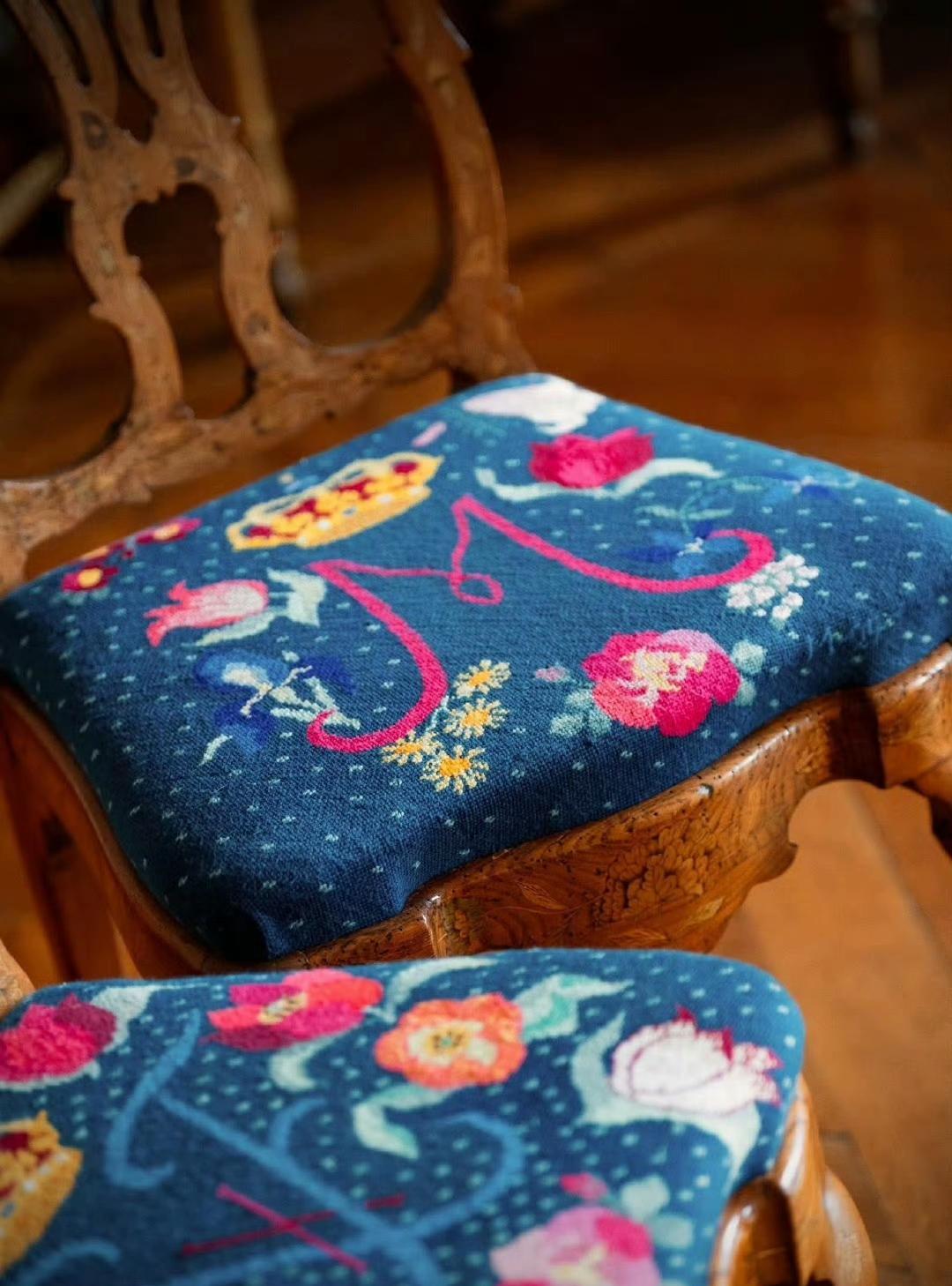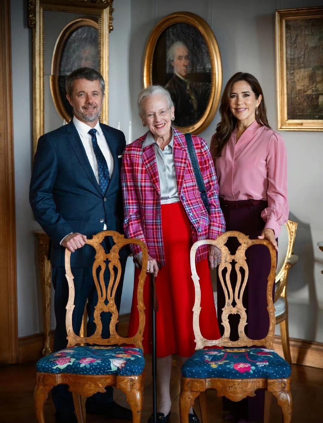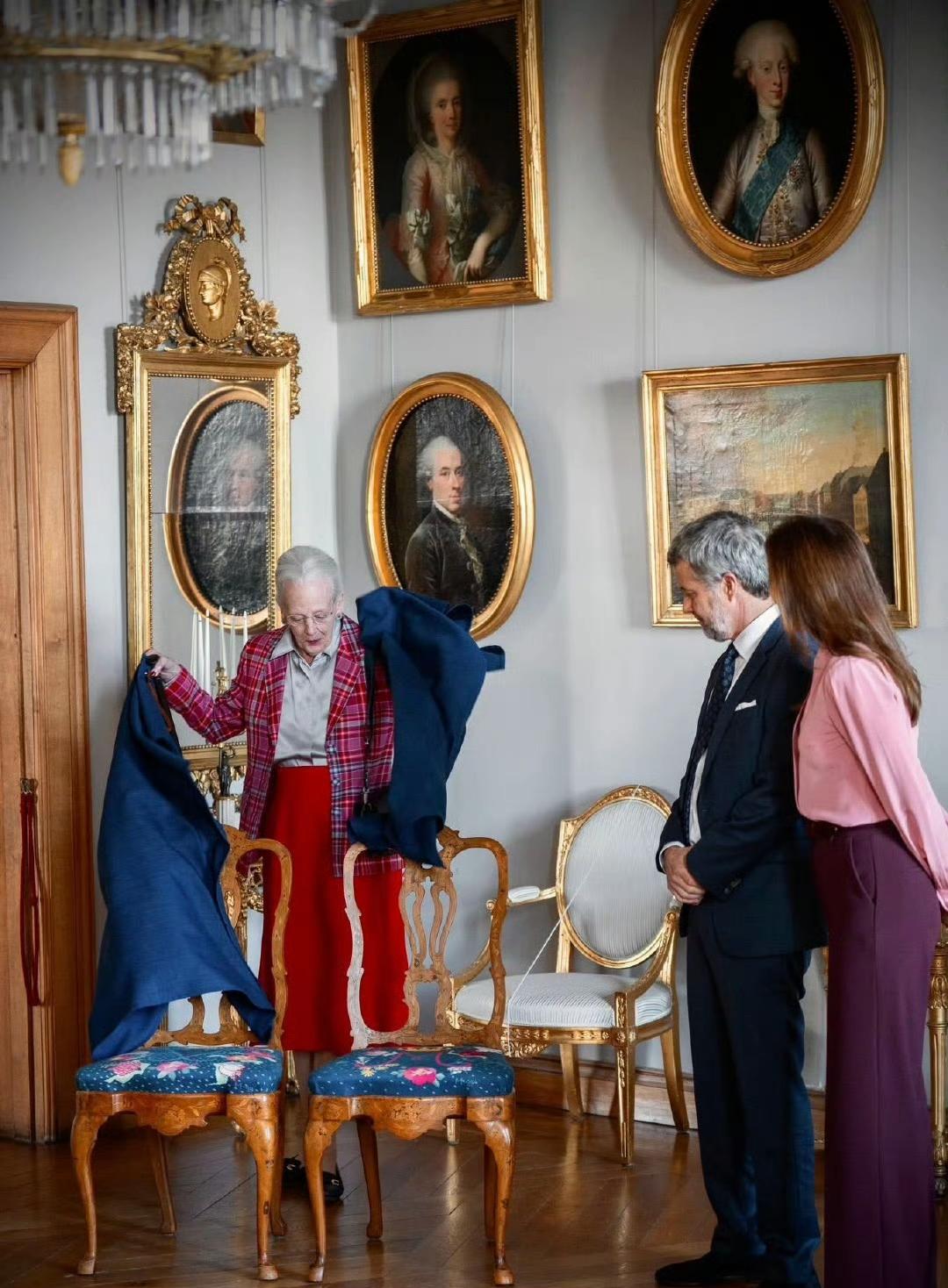 2025.9.26 丹麦女王玛格丽特二世在腓特烈堡城堡为长子长媳揭晓了一对专为他们打造的两把特别绣花椅,由女王特别主动设计,供他们访问腓特烈堡时使用,椅子上的刺绣图案有丹麦国王夫妇的画押以及郁金香、玫瑰、百合、鸢尾、铁线莲、风铃草和丝绒花等等