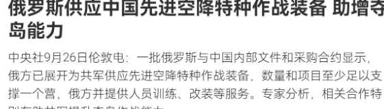法媒声称,俄罗斯已经供应中国先进空降特种作战装备,以帮助中国增强夺岛作战能力!9月27日,根据法新社报道,法媒称,一批俄罗斯与中国内部文件和采购合约显示,俄方已展开为共军供应先进空降特种作战装备。这些装备数量和项目至少足以支撑一个营,俄方还为解放军提供人员训练、改装等服务。