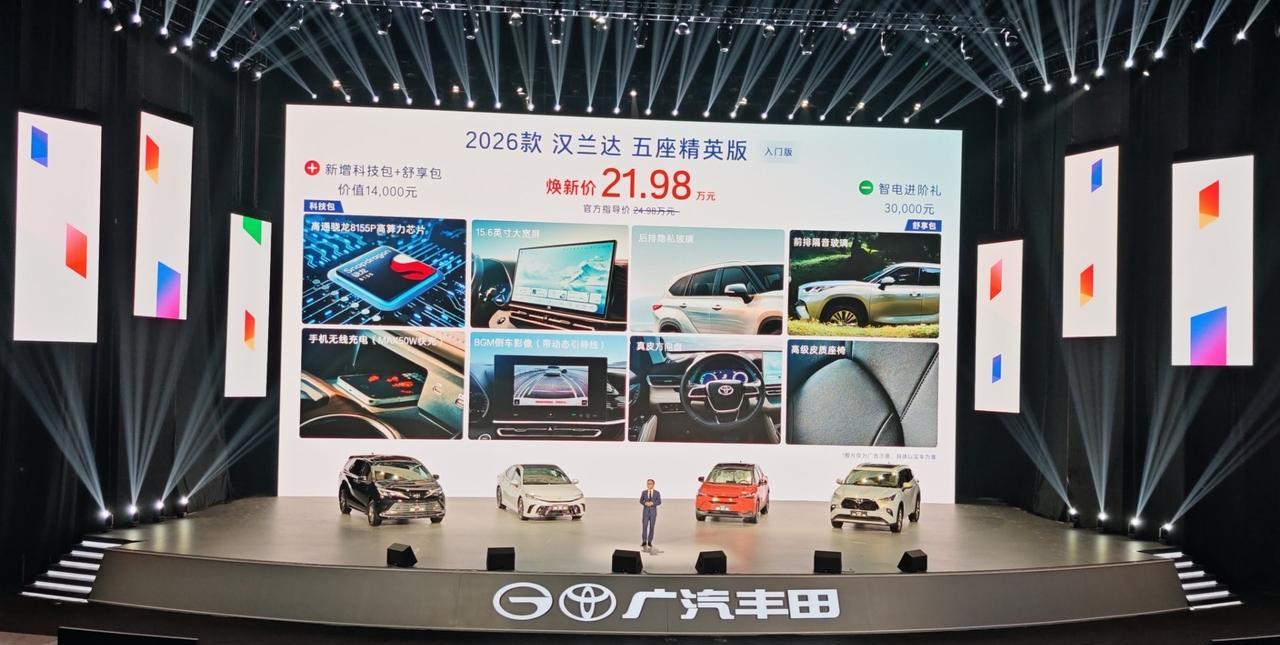 广汽丰田2026款全球车上市:价降配升,诚意十足! 广汽丰田2026款汉兰达、凯美瑞、赛那、锋兰达今日正式上市!这次广丰做到“价降配升”,诚意拉满。 锋兰达10.28万起,赛那26.98万起,凯美瑞、汉兰达起售价也大幅下调。全系标配TSS智驾和高通8155芯片,汉兰达换15.6英寸大屏,赛那新增四驱航空座椅款。更有混动技术普及与动力总成终身质保,让大家买得值、用得安心! #广汽丰田2026款新车上市#
