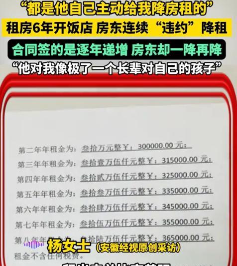“这个房东董大爷,给全网的房东上了一课!”9月26日报道,安徽合肥,女子开饭店租金30万一年,合同签的是房租逐年递增,但万万没想到,房东董大爷连续“违约”,把房租一降再降。网友:我想把这视频转发给我门市的房东…… 2019年,杨大姐在合肥一直给人打工,白天黑夜地忙,好不容易攒下点积蓄,还跟亲戚借了些。 兜里钱一凑齐,她就琢磨着:“老这么打工不是个事儿,得干点属于自己的。” 想着干脆开个小饭馆,卖农家菜,老百姓爱吃,也不挑人。 说干就干,她转悠了半个多月,跑了十来个地方。 不是位置太偏,根本没人流量,就是房租高得吓人。 直到有天路过一条主干道,看见董大爷这套临街的铺子。 面积正合适,200多平,饭点人多了也不怕。 周边小区密密麻麻,老年人多,年轻人也不少,人流量看着就稳当。 唯一让她犯难的,就是房租。 第一次跟董大爷谈的时候,杨大姐心里就打鼓。 开饭店投入大,前期装修、厨房设备、桌椅板凳、请人做工,哪一样不是钱?她憋了半天才小声开口:“叔,房租能不能再宽松点?我刚起步,手里真紧。” 董大爷没直接答应,也没翻脸,笑呵呵地说:“姑娘,这房子地段你也看见了。周边同样大小的,人家都要32万一年,我喊你30万,已经算是实在了。至于以后嘛,年年物价都涨,房租每年递增。” 杨大姐心里明白,租这种临街铺子,涨房租是常态,只要生意稳定,她咬牙也能撑。 可她蹲在门口算来算去:一年三十万,加上每年递增,光前三年房租就得接近一百万。 她心里直冒汗,合计着要不要硬着头皮上。 可再想想,这门面是真合心意。 错过这一个,不知道还得找多久。 回去后她跟家里人反复商量,最后还是咬了牙:“干!先开起来再说。只要菜味道好,服务不掉链子,老百姓认咱,房租再高也能挣回来。” 结果没过多久,疫情来了。 饭店一关就是两个月,杨大姐愁得夜里睡不着觉,账单摊开一大桌子,算来算去都没法凑齐房租。 正当她发愁时,董大爷一个电话打过来:“丫头,今年不容易,房租免你2万。”那一刻,杨大姐眼泪都下来了。 她本以为只是特殊时期的照顾,没想到这只是个开始。 到了2021年,合同里写着该涨租了,董大爷却说:“那5000块零头就算了,转账太麻烦。” 后来有一次,董大爷在店里吃饭,看到杨大姐的小女儿走路慢吞吞的,细问才知道孩子发育迟缓,需要长期康复治疗。 没过几天,他就直接上门说:“以后房租不涨了,孩子康复要紧。合同里写的那些递增,全免了。” 要知道,这一免就是七万多块。 杨大姐说,那一刻,她心里比拿到钱还踏实。 2023年,董大爷特意到店里一趟,拍着胸口说:“丫头,你放心,就算我不在了,也会跟孩子们交代好,这房子一定给你留着。” 去年生意下滑,杨大姐不得不从11个员工裁到只剩四五个。 董大爷看着心疼,又主动把房租从30万降到28万,还劝她:“不是你店不好,是现在生意难做,别怕,咬牙坚持。” 前几天,他又带朋友来吃饭,当场拍板:“明年再给你降2万,26万就行。” 杨大姐端着酒杯手都在抖,感激得话都说不出来。 董大爷却笑呵呵地说:“别谢我,你好我才能好,你要真想谢,就敬我一杯酒。” 相处六年,杨大姐早把董大爷当长辈。 他住得近,常来店里吃饭,却从不白吃,每次结账最多抹个零头。 他还常帮着操心:杨大姐去陪孩子做康复,他会打电话提醒店里别耽误事,杨大姐买房没跟他商量,他会半开玩笑地“数落”她。 甚至她的体检报告,他也要拿来仔细看,叮嘱她:“钱赚不完,身体要紧。” 这事传到网上后,评论区炸开了锅。 有人说:“这房东不是房东,简直是义父。” 也有人酸自家房东:“我们这边,生意刚有点起色就涨租,结果铺子空了大半年。” 更多人看明白了门道:“大爷看似少收了点钱,但换来的是一个稳定的租客,这才是双赢。” 杨大姐说得最实在:“要是换作我自己当房东,未必能做到他这样。” 在她眼里,董大爷不只是房东,更是她的贵人。 网友们也说,最让人感动的不是那几万块钱的房租,而是这份把租客当自己人的真心。 对此你怎么看? 信源:洛阳网