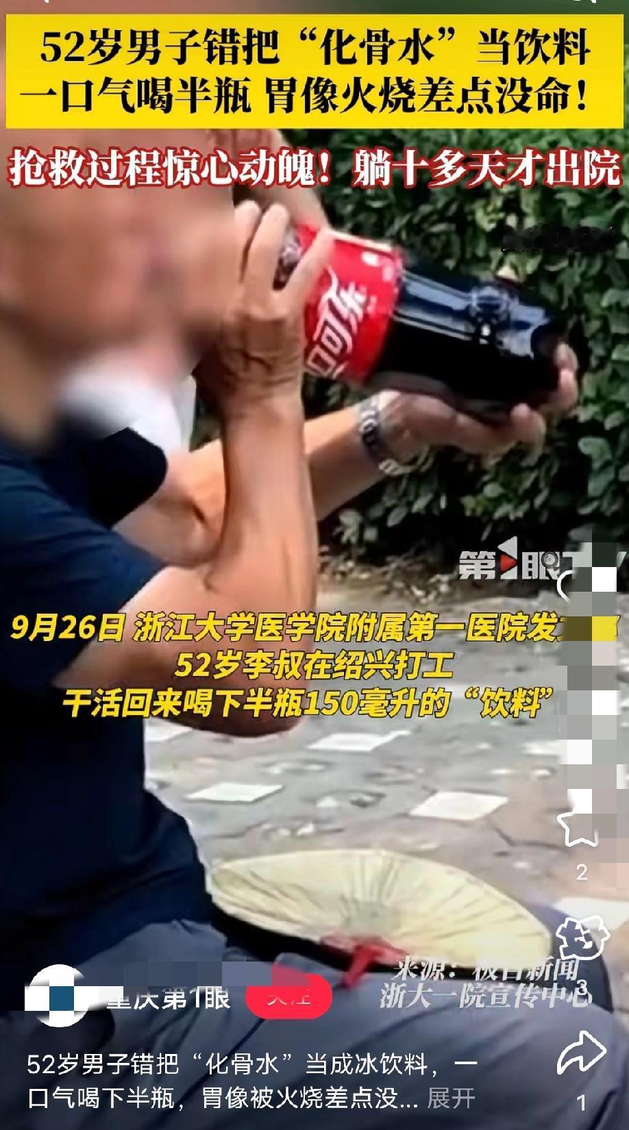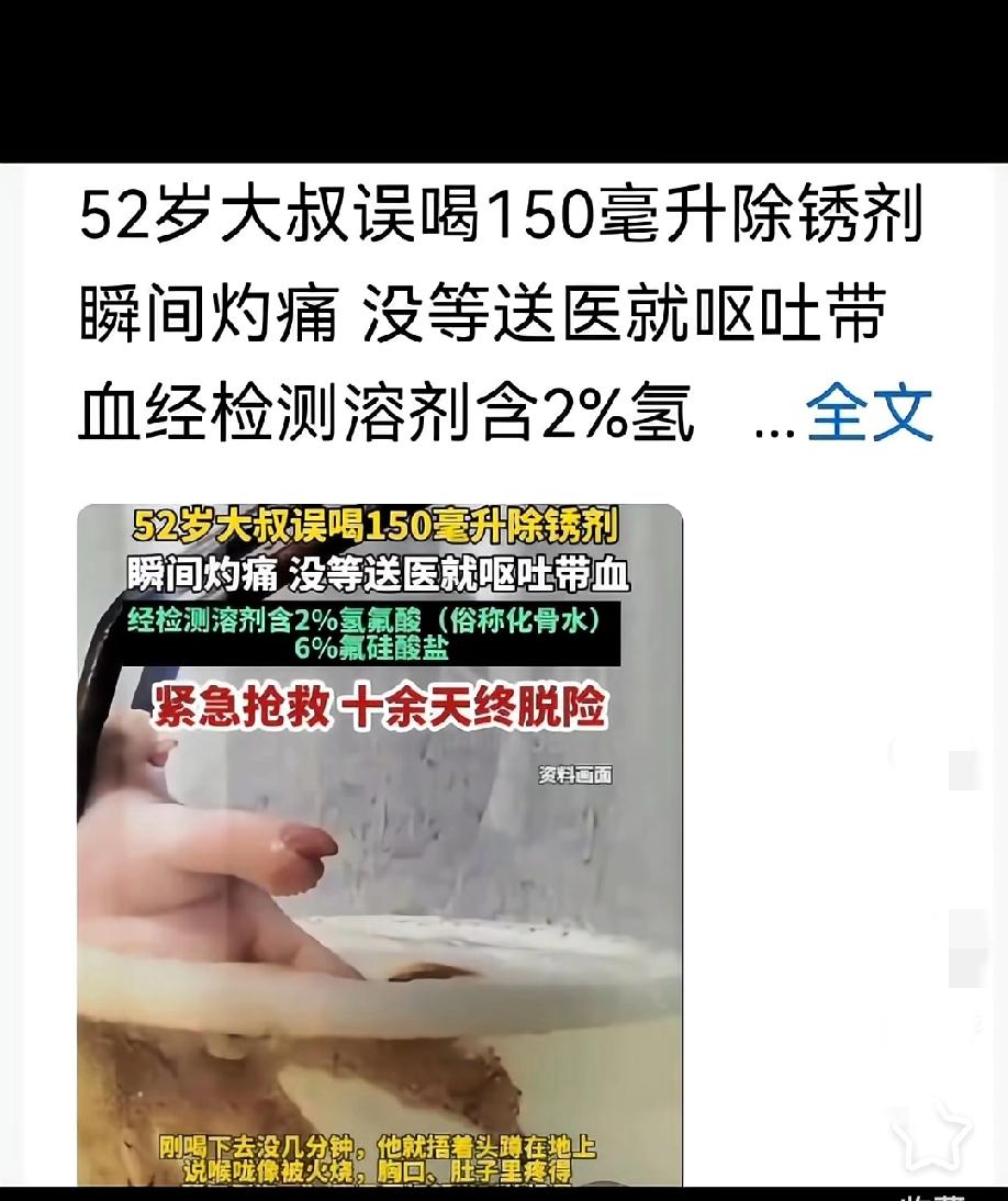 谁能想到, 52岁的李叔随手喝的“康师傅”, 竟是能蚀穿骨头的“化骨水”?150毫升下肚,喉咙烧得冒火、呕血休克,氟离子还在偷血钙、毁肝肾,差点把人从鬼门关拖走,这哪是误喝,简直是在跟死神赌命! 更吓人的是,氢氟酸这东西毒性排第一,巴掌大接触就致命,好多人却把装它的瓶子随便扔,跟饮料混在一起。 别觉得危险离得远,家里的清洁剂、除锈剂说不定就藏着它,随手乱摆的习惯,可能就是埋给家人的雷! 你家会特意把化学品和食物分开放吗?要是看到陌生瓶子,你会先确认再碰吗?